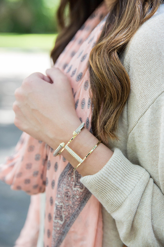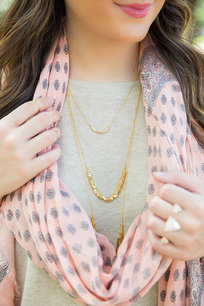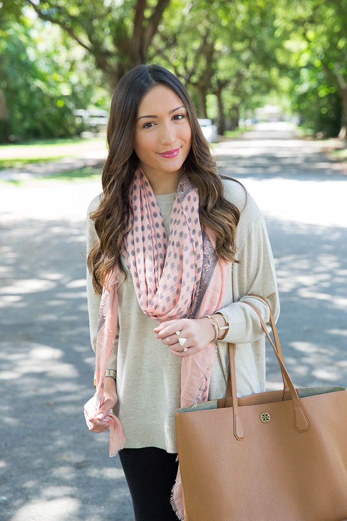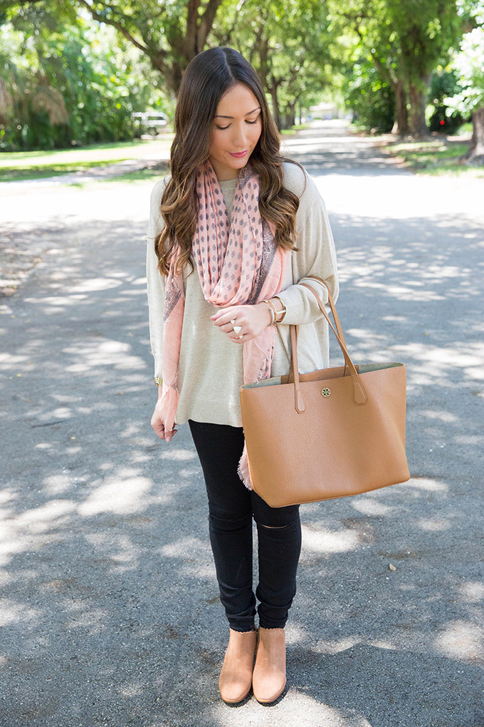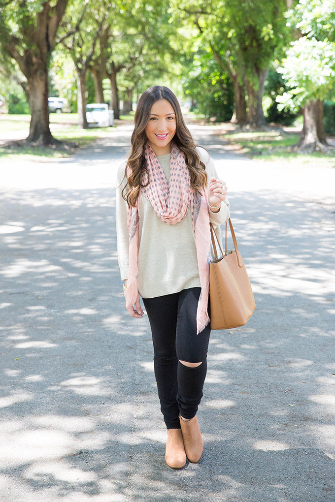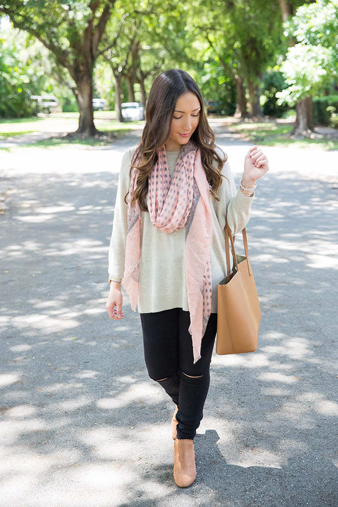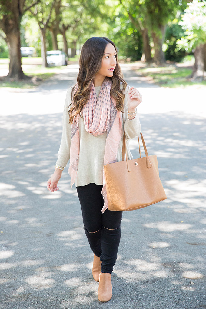 A great scarf is always needed. I love this color because it’s easy to transition and looks great with just about anything! I love how it added color to this outfit.