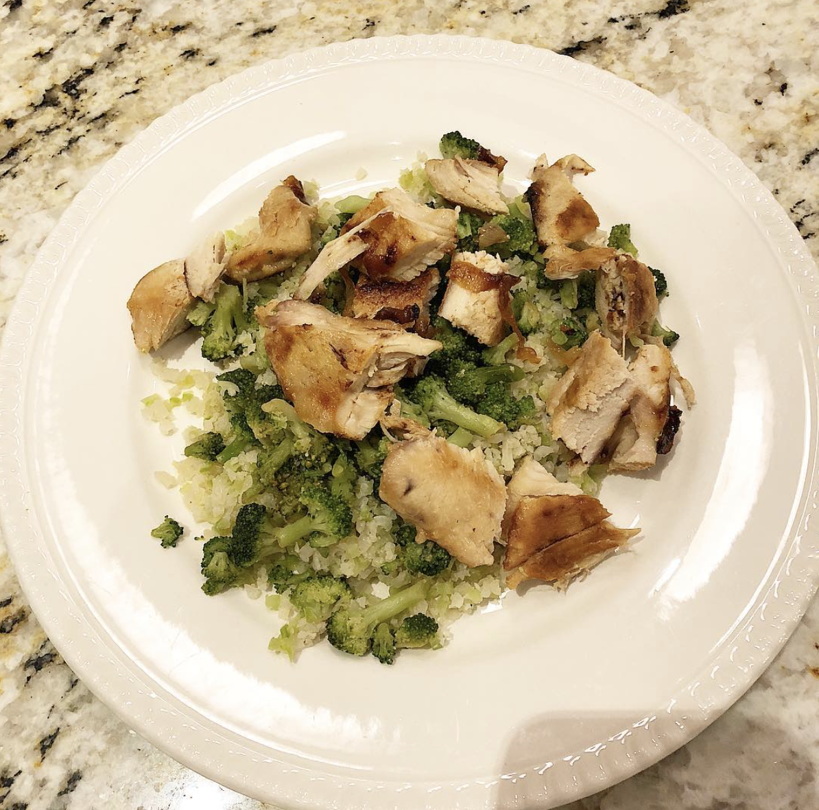 Season chicken with sea salt, garlic powered and olive oil. Cut round pieces of white onion and put on top of chicken. I always like to let the food sit in a covered container in the fridge for at least 30 minutes to 1 hour (or overnight). Cook the chicken in a covered saucepan make sure you brown it. Let it sit to cool down a little and cut in pieces to add to the cauliflower rice. •