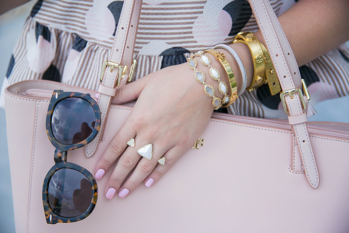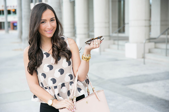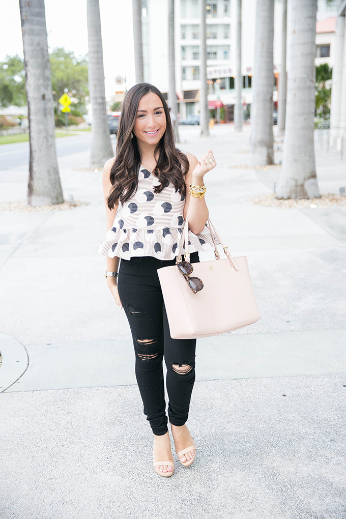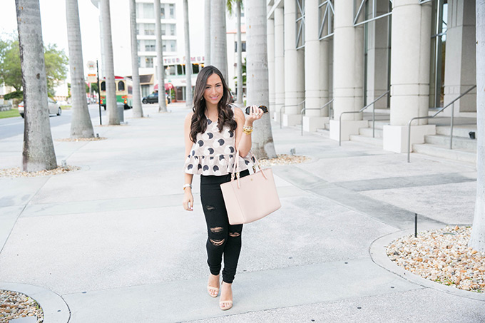 If you follow me on Instagram, you’ll see that I’ve been wearing this 1.STATE peplum blouse a little too much. It combines some of my favorite things… blush, peplum and polka dots! It’s funny because I used to hate polka dots but now I love them. I think they’re so classic and can add a fun twist to an outfit, especially when paired with stripes! I decided to really carry out the blush theme with this new York Tote that fits and matches with everything! I was going to wear regular denim with this blouse, but I loved the way it looked with black ripped denim and some open-toed sandals.