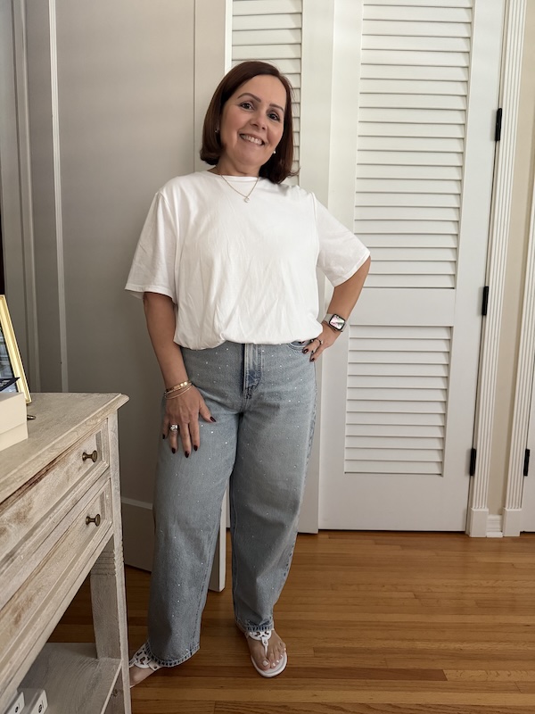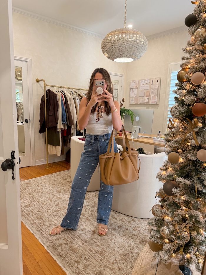 Speaking of sparkled embellished jeans, these have pearls on them and are also absolutely amazing! I have both… hehe. I find them different enough and these you can dress up a little more because of the color. I also have them paired with the BEST bra-free tank. I would have it in every color if I could (and I might). Right now, I have it in black, brown, beige, white and grey. I wear XS! And, this tote… ah I love it! If you’re someone who carries a LOT (like me), this pebbled leather tote is 1000/10. it fits so much and is comfortable to wear.