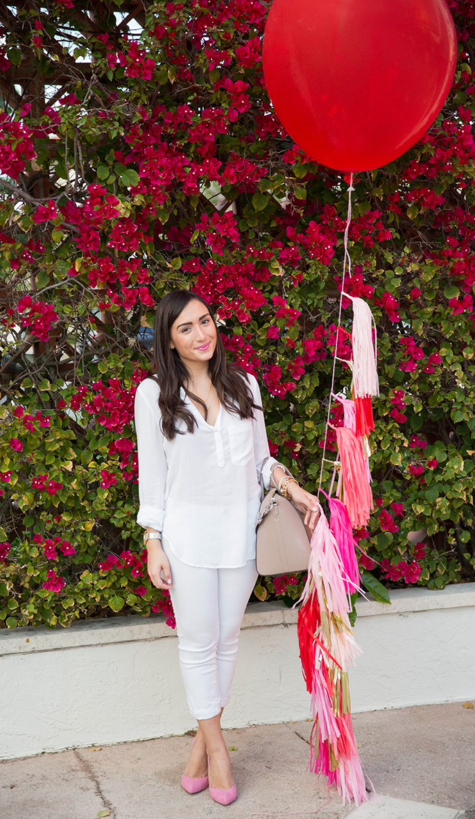 TOP: Bella Dahl Henley Top c/o | JEANS: 7fam (also love these and this less expensive version) | HEELS: Kristin Cavallari (absolutely obsessed with them… dying to get these) | PURSE: Givenchy Antigona (same color in this style… also love this style and this one) | NECKLACE: Gryphon Laine Jewelry c/o | RINGS: Marshelly’s c/o | BALLOON: Studio Mucci | BRACELETS: David Yurman, Taudrey Jewelry c/o | WATCH: Michele | LIPS: Mac ‘Pink Nouveau’