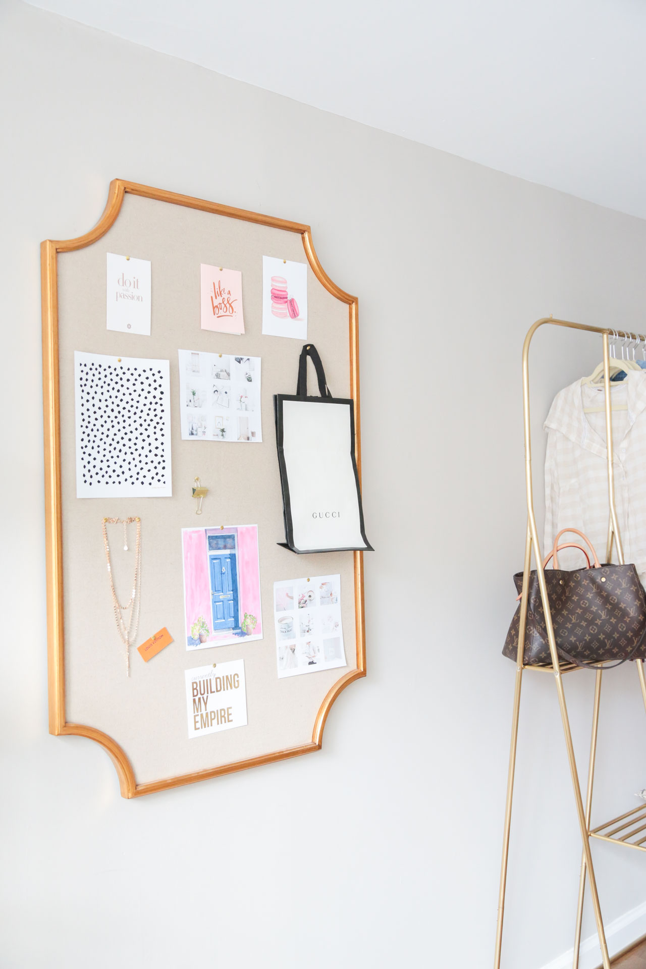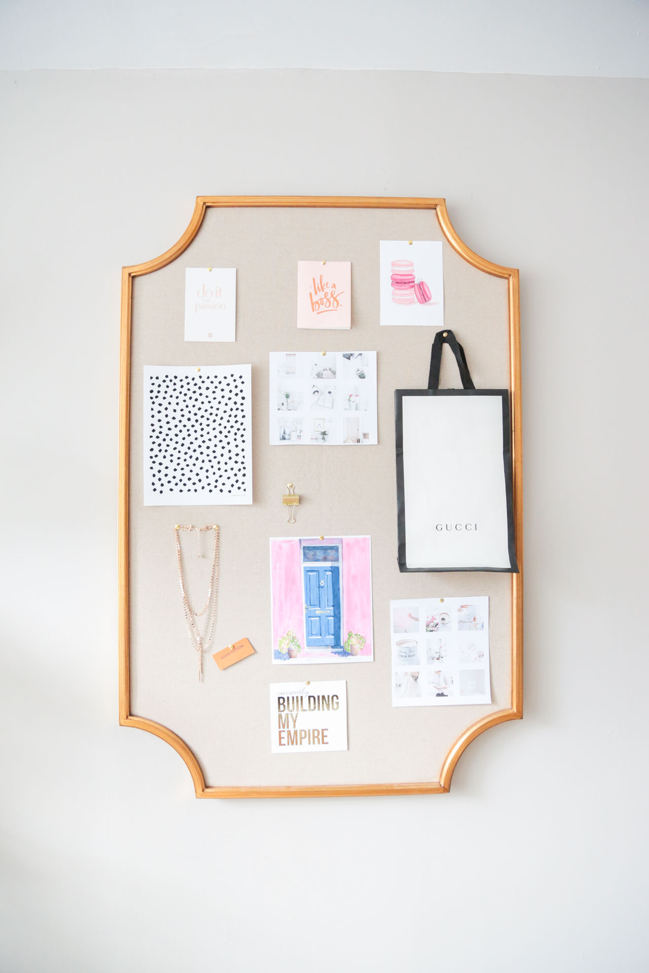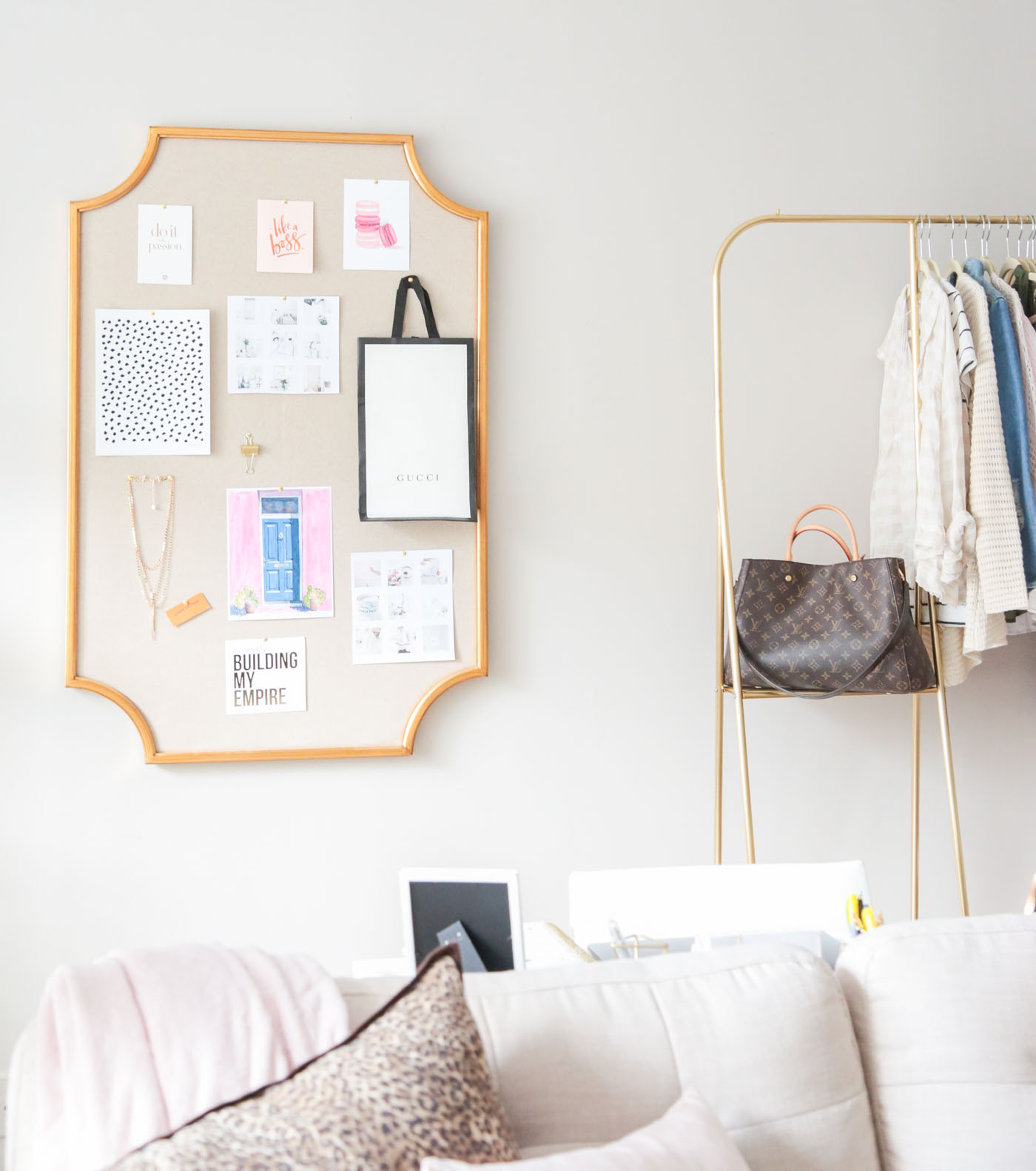 I then added different things that make me happy as well as short quotes that push me to work hard. Eventually, I want to add maybe a Pantone strip of my favorite pinks, a fabric and some kind of texture. It’s really made my house feel more like a home and it’s definitely brought so much more light and color to my living room office.