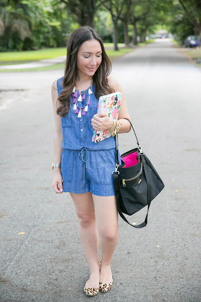 PS. I styled it with a denim romper because this is something I would wear to school with an added pop of color in my necklace. Just because you wear a black handbag doesn’t mean you can’t accessorize with colorful jewelry! The romper is no longer available but I’ve linked similar ones below.