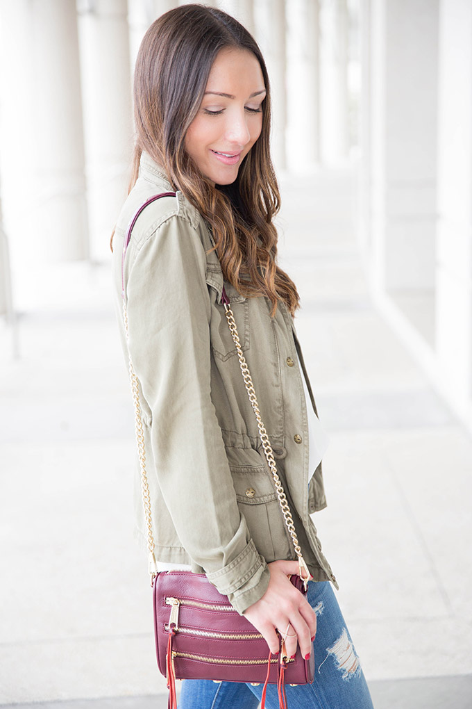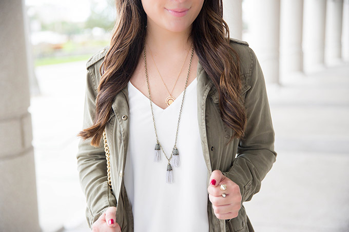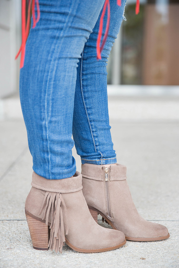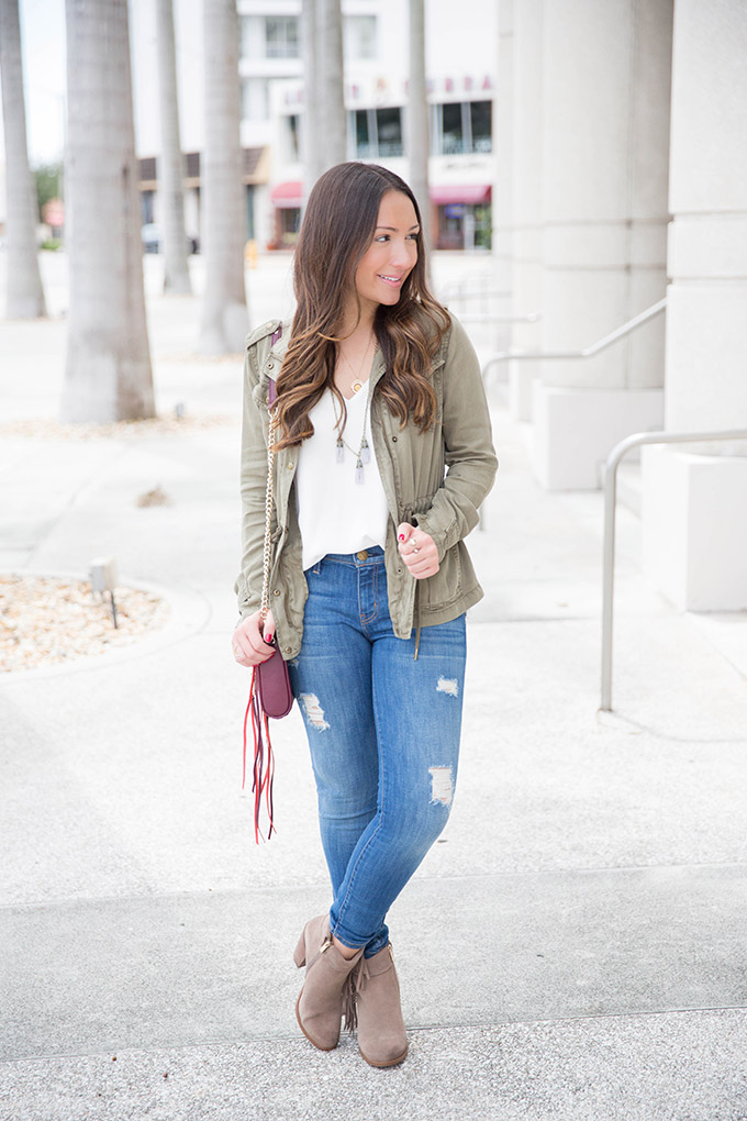OUTFIT 2: For my second outfit, I wore adorable fringe booties (huge markdown…thanks, Marshalls!) and a utility jacket. I had been looking for a perfect utility jacket for a while but couldn’t find one that fit my taste and my budget. This one does both and was over 50% off! I would wear this to go out at night with friends because it’s a little dressier and the booties really add a fun edge to the outfit.
