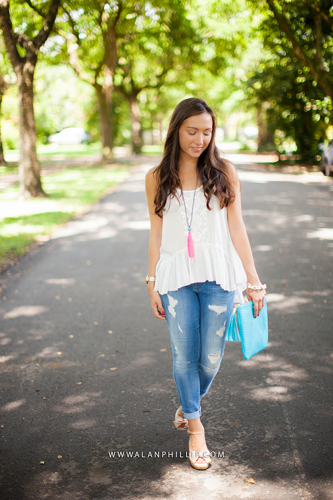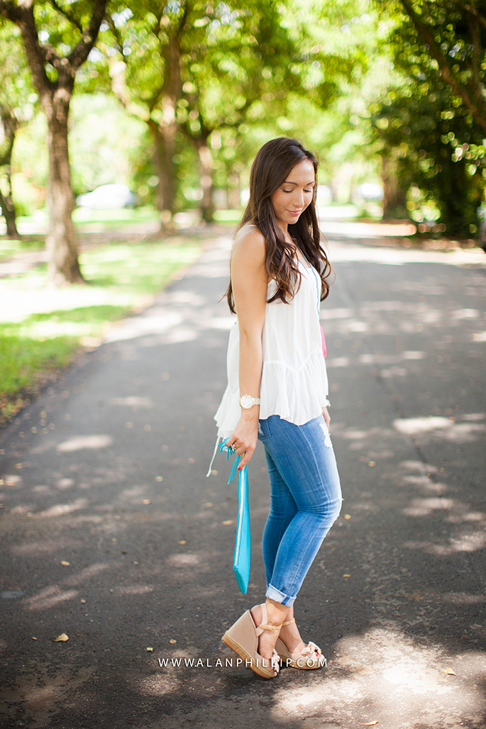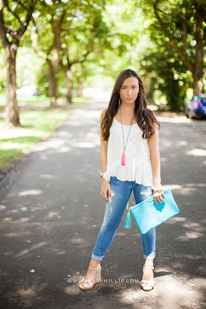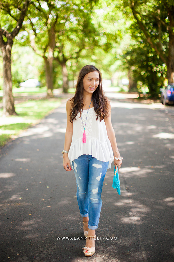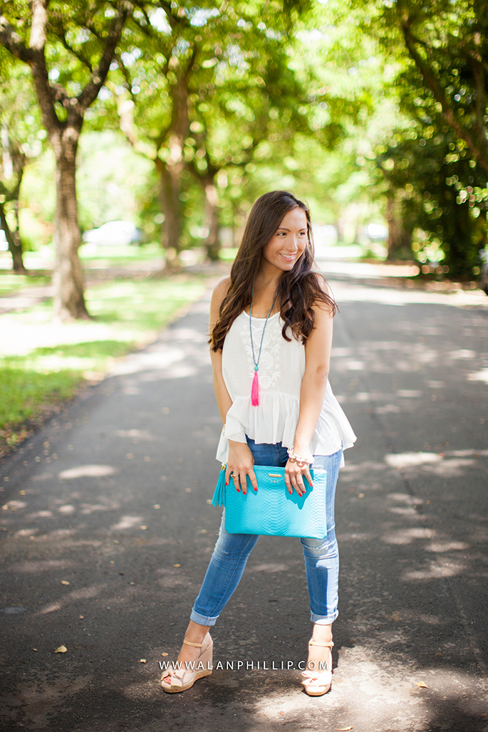 Happy Sunday (and World Cup game day, if you’re into that). I decided to pair my brand new tassel necklaces (pictured below in both colors) from Gioie Collection with a more casual look; I love these cropped skinny jeans from 7 For All Mankind and these are on sale right now! Usually, I wear dressier outfits but I wanted to post an everyday look that you could very likely pull off with a pair of jeans, wedges and a basic tank! 🙂 What’s your go-to outfit for the summer?