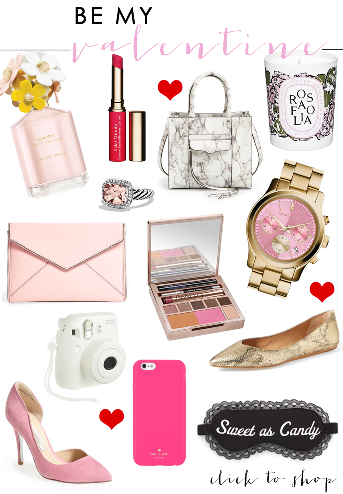 Pink Suede Pumps | Pink Envelope Clutch | Marble Print Crossbody | Pink iPhone Case | Urban Decay Palette | Candle | White Mini Camera | ‘Sweet as Candy’ Eye Mask | Snakeskin Flats | Michael Kors Watch | Lip Balm (it’s amazing and gives your lips a natural shine with a hint of color while moisturizing…all at the same time!) | David Yurman Ring | Marc Jacobs Perfume (one of my all-time favorites)