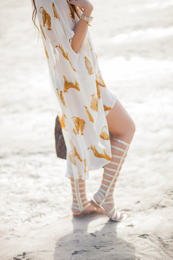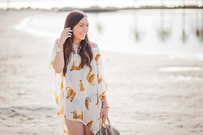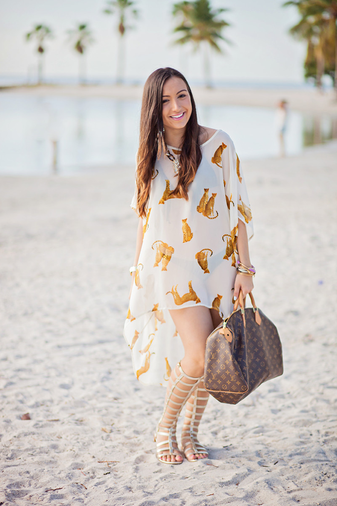 As summer is quickly approaching and the Miami heat is becoming unbearable, I thought it was necessary to do a summer post. In Miami, summer is about going to the beach, relaxing and getting some sun (clearly something I really need). But it’s also about looking your best while doing so. I absolutely love this coverup and would not give it up for anything. I love the high low hemline, the print and the neckline. Sometimes I wish there was a going-out-dress version of it because I want to wear it all of the time. I paired it with my favorite gladiators to show you guys that, if you’re staying in a beach town and you want to go out to lunch, you can dress up a coverup with some beautiful shoes and a big purse to fit all of your summer items. What’s in my bag? My phone, YSL lipstick, my favorite new sunglasses, some sunscreen and my planner. You can never be too overdressed for a beach day!