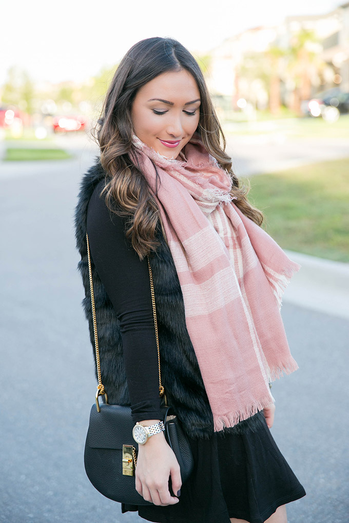 I wore this black swing dress for the first time over thanksgiving break (for thanksgiving dinner) and I really love it! The material is super soft and I dressed it up with a faux fur vest and OTK boots. It’s only $46, too. By the end of the night, I took off the vest and scarf because Tampa was a little too hot for that. I had a great time with family over the long weekend and hope you did, too! If you have any upcoming holiday parties or events, this is a great dress to have. It’s also just a great wardrobe essential! My scarf is pretty awesome too, and SO comfortable. And it’s only $13! It looks so pretty with something simple… like this black swing dress! Haha. 🙂