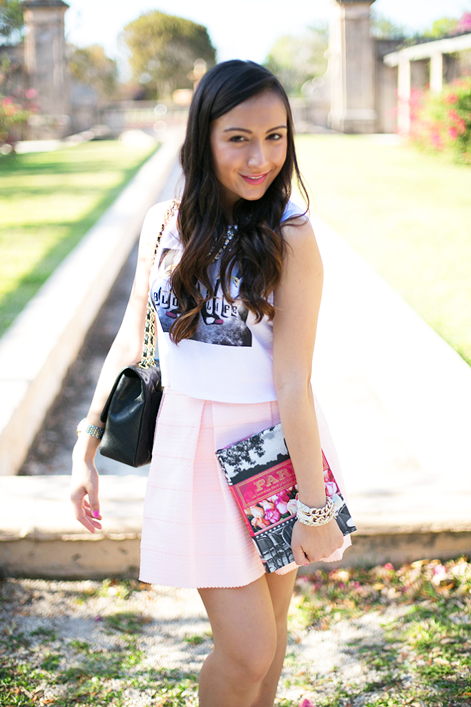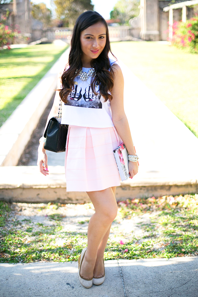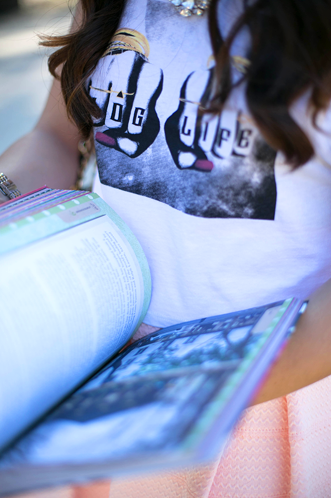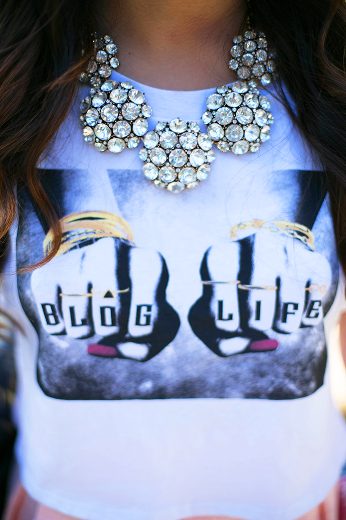 This was one of the most fun shoots I’ve ever done. I got to show off what it’s like to be a blogger. As a blogger, I’m always looking for the latest fashion trends, inspiration and ideas (that’s where the book comes into play) and I’m always either on my phone scrolling through my Instagram feed or answering emails. Oh, and not to mention… let me take a selfie! I’m always taking selfies to show off the newest pieces I’ve received or just because I live in Miami and we’re the top selfie city… that’s not a surprise. I absolutely love this tee because it has the word blog in it, so what could be better for a devoted blogger? I hope you guys like this post as much as I do! It was really hard to stand still for the photos because my mom was playing the song “Happy” and all I wanted to do was dance! Being a blogger is absolutely amazing but it’s also filled with lots of emails, research and, of course, selfies! By the way, how absolutely stunning is this necklace?!