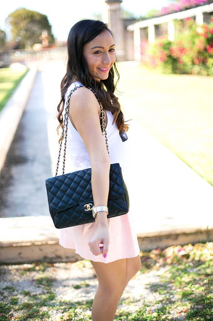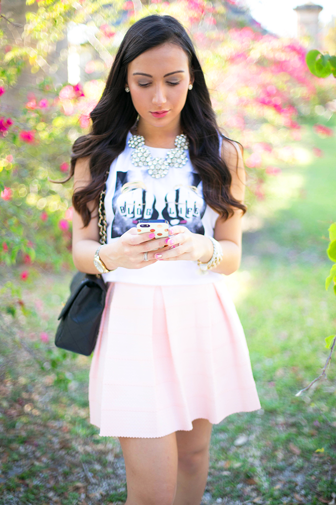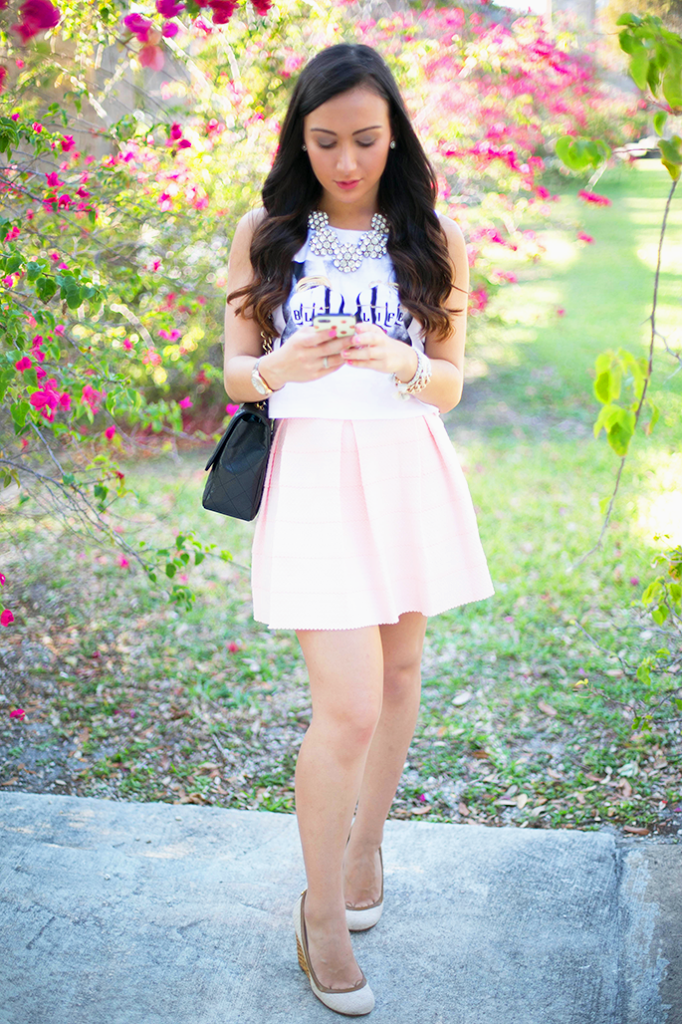 Top, skirt: Reveal Boutique c/o | Necklace: Accessory Jane | Shoes: Tory Burch (old) | Bracelets: Lucky Sage Shop c/o | Purse: Chanel | Book: Anthropologie | Phone case: Kate Spade (similar)