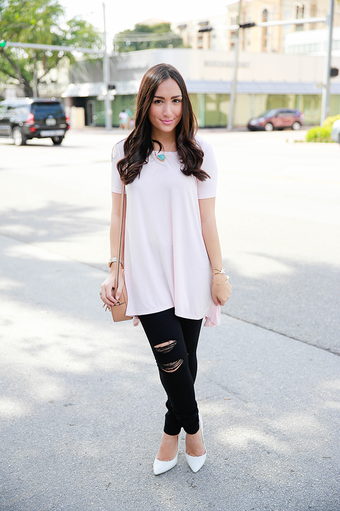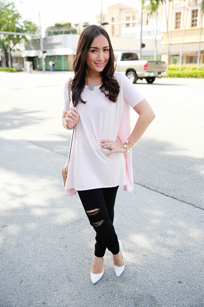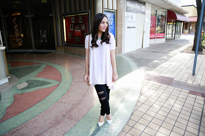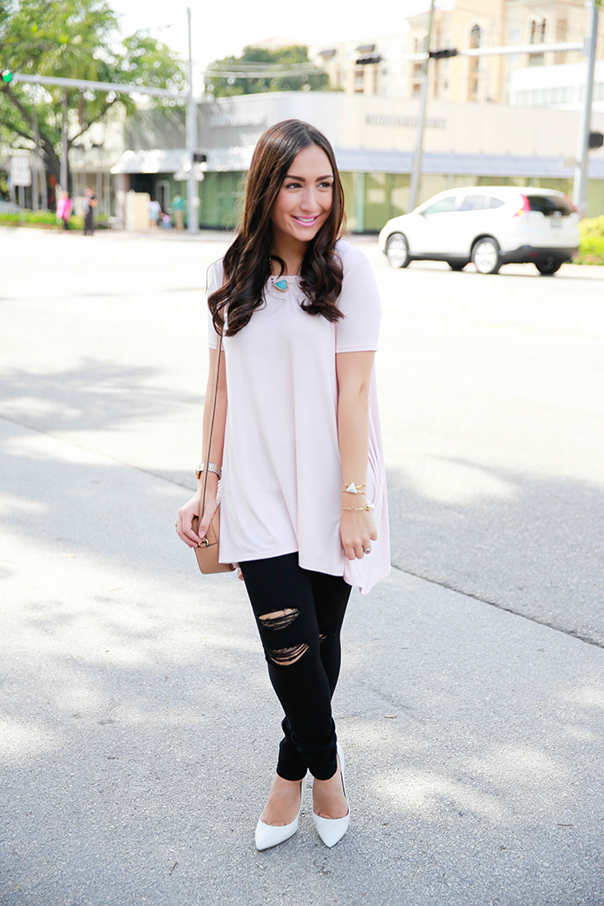 If I could easily describe this blush tunic in one word, I wouldn’t be able to. What I can say, though, is that I am obsessed with it. Being a college student, comfort is key for me. I’m constantly running to and from school and need to feel comfortable while sitting through hour-long classes. My favorite part about this tunic is that it mixes comfort with style to create an effortless look for weekend wear. I recently purchased this pair of black jeans and they are the best! I had been looking for a pair of destructed black denim for a while and tried these on and knew I had to have them. They’re extremely comfortable (they fit like leggings but don’t look like them) and hug the body in the right areas. To keep the neutral tones, I wore my white pumps and new Gucci bag, which is so much more spacious than I thought! Not to mention, I just had to wear my favorite necklace from Alexandra Gioia. Her shop, filled with handmade items, has quickly become of my favorite shops…ever!