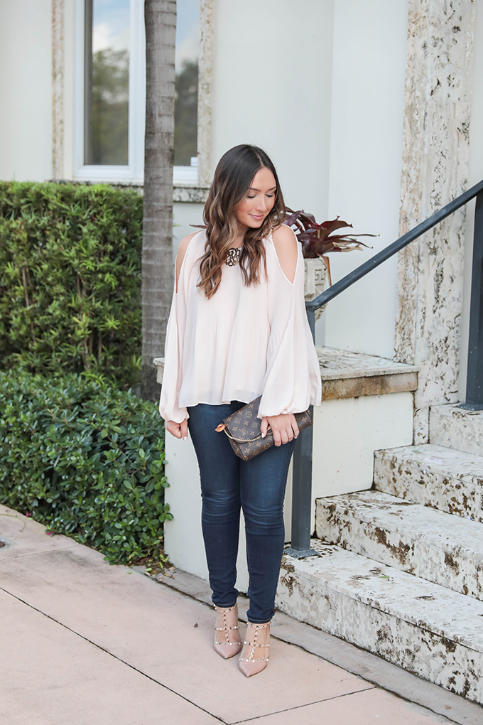 I’m absolutely loving this blush pleated blouse. It’s perfect for date night, during the day and special occasions. Blush is a huge color this fall so make sure to take advantage… I know I will! Pleats are also in, too, so this top is a win-win. I paired it with my extra large monogram necklace (my favorite) and some dark skinny jeans.