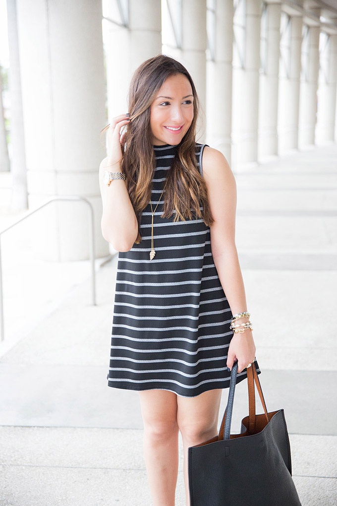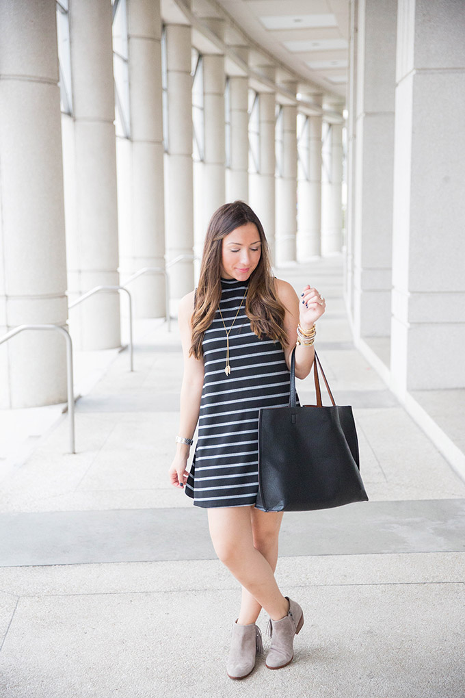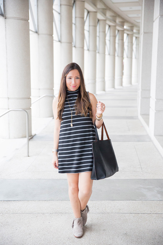 I’m so ready to transition to fall and this is a great outfit to do that in! This high-neck swing dress is great to wear now and later on with a jean jacket once there’s a cool breeze in the air! It also looks really cute as a tunic with leggings and OTK boots. That’s a great option if you’re a bit taller, since this dress is on the shorter side (I’m 5’3… next time, I’m going to wear it as a tunic!).