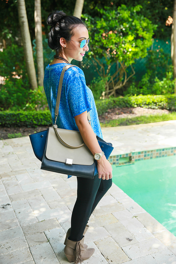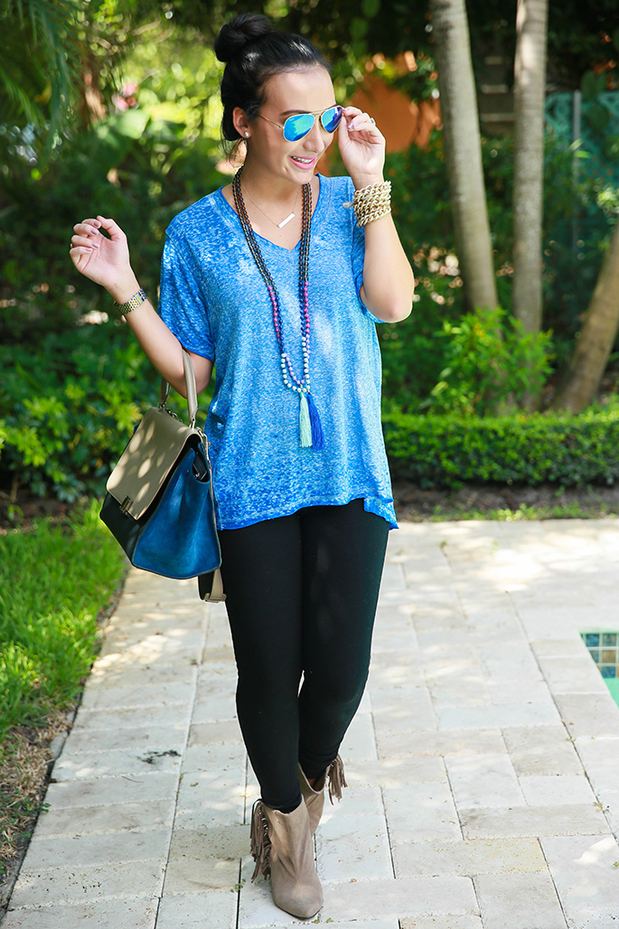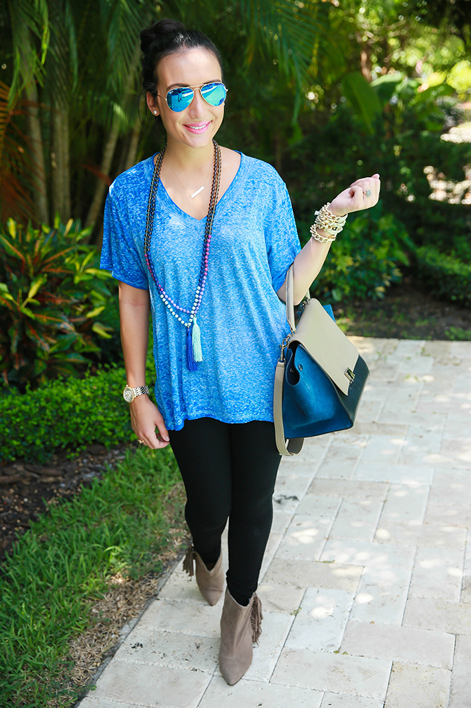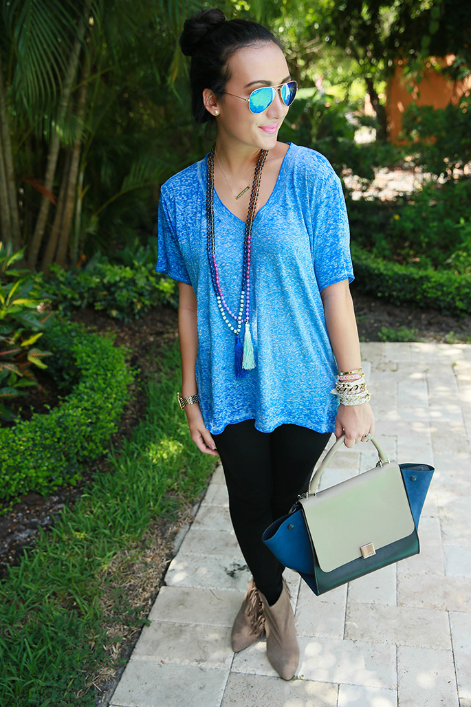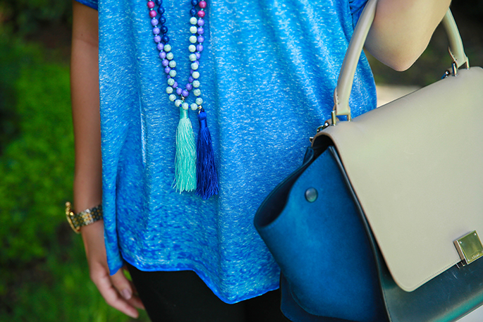 There’s no doubt that blues are in for the season. I absolutely love this tee from Chantilly Dallas because it’s comfortable, oversized and can give an edgy look to basically any outfit. I paired it with some booties and black denim to make it something that can easily transition to fall. Oh, and I’m loving these tassel necklaces. I bought every color! They add color and vivacity to the outfit, don’t you think? Anyways, this is a really easy outfit to replicate or try on your own and I think you should give it a shot! There’s nothing better than a calm, cool & collected outfit that just looks so easy and chic at the same time. Maybe even try adding a statement necklace instead if you really want to dress it up! Blues are in so bring out those hues for the season! Have a great Monday. 🙂