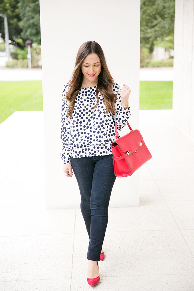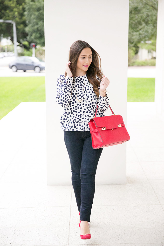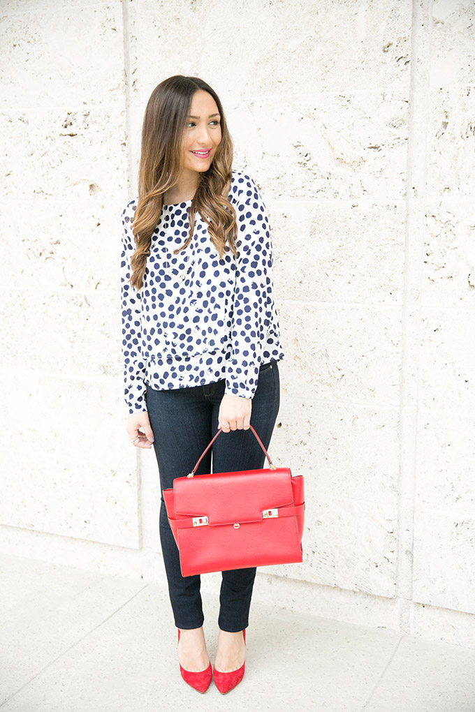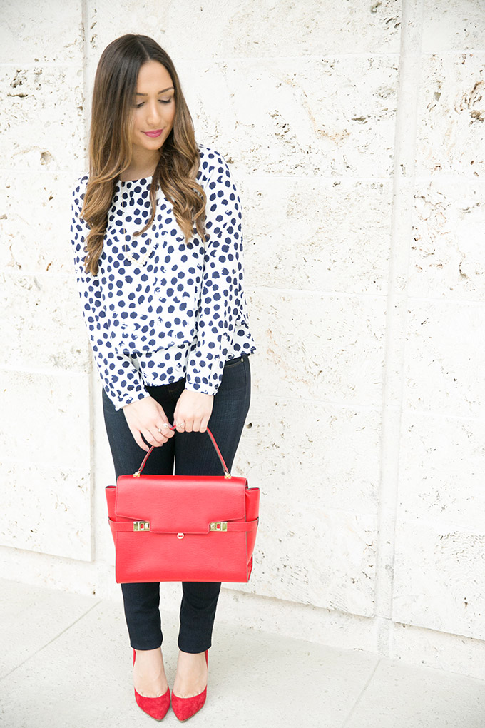 Anyways, on to the outfit. I shot this outfit a while back, for a particular collaboration, but decided to keep it for December. This is such a perfect casual holiday outfit! I could see myself wearing this to holiday dinners, parties, brunches and anything else. It’s classy, just enough dressed up and has that holiday red. This satchel has been one of my favorites and it comes in the prettiest colors! You can get a good discount on it, too… it’s a good gift. 🙂 This polka dot blouse is also seriously one of my favorite tops ever! It’s such a classic piece and can be easily dressed up or down. I wore it to go out with my boss for an event a couple of weeks ago and dressed it down with wedges instead of pumps. I love that it’s a tiered blouse and the back is also so cute because it has two super subtle flaps!