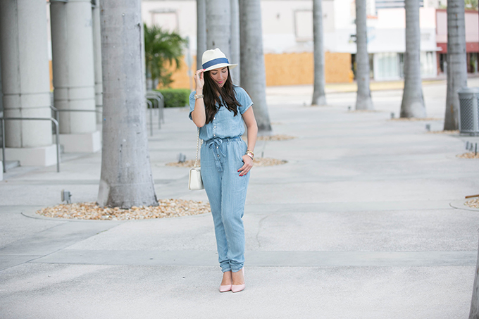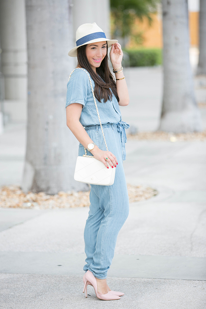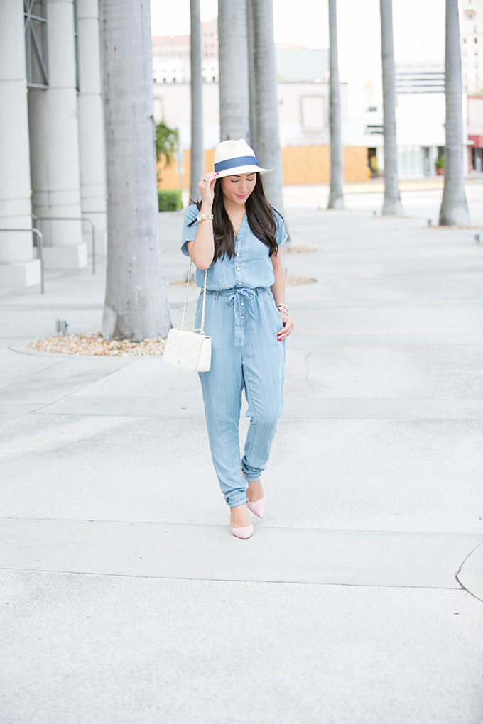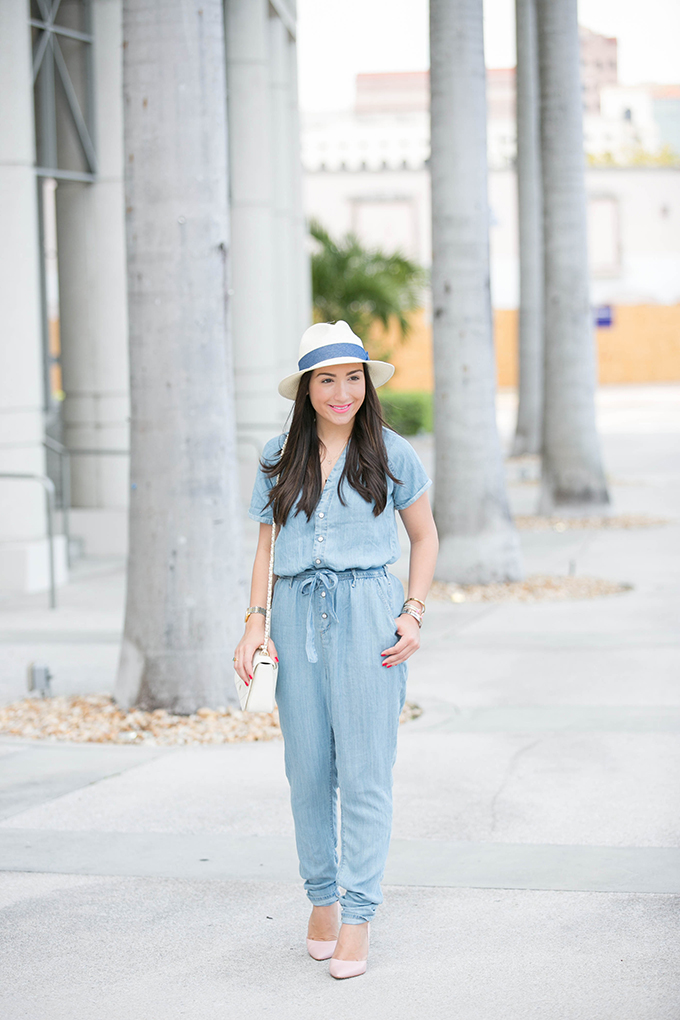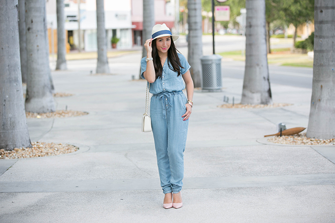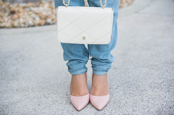 This denim jumpsuit from Lulu*s is so comfortable, fun and perfect for spring and summer because it’s not heavy at all! When I received it, I thought it might be a little thicker than what I had originally wanted. Nope! It’s perfect! In this 90 degree weather, I was totally fine wearing it. I really wanted to compliment the light wash color of the denim by wearing these blush colored pumps. Oh-my-gosh. These are so comfortable! I could walk for miles in them! It takes a lot for a pump to be really comfortable for me {I’m a fan of this pump because of its comfort}. So, when I do find a pump that’s comfortable, it’s like I’ve found the gold at the end of a rainbow. They come in two other colors, but I love this one for spring. It goes with so much and really adds a feminine touch to any outfit. I especially love how it paired with my denim jumpsuit and white cross body.