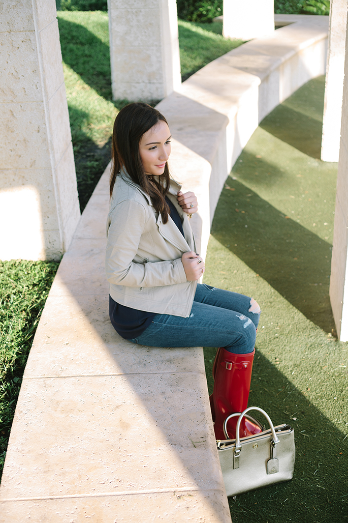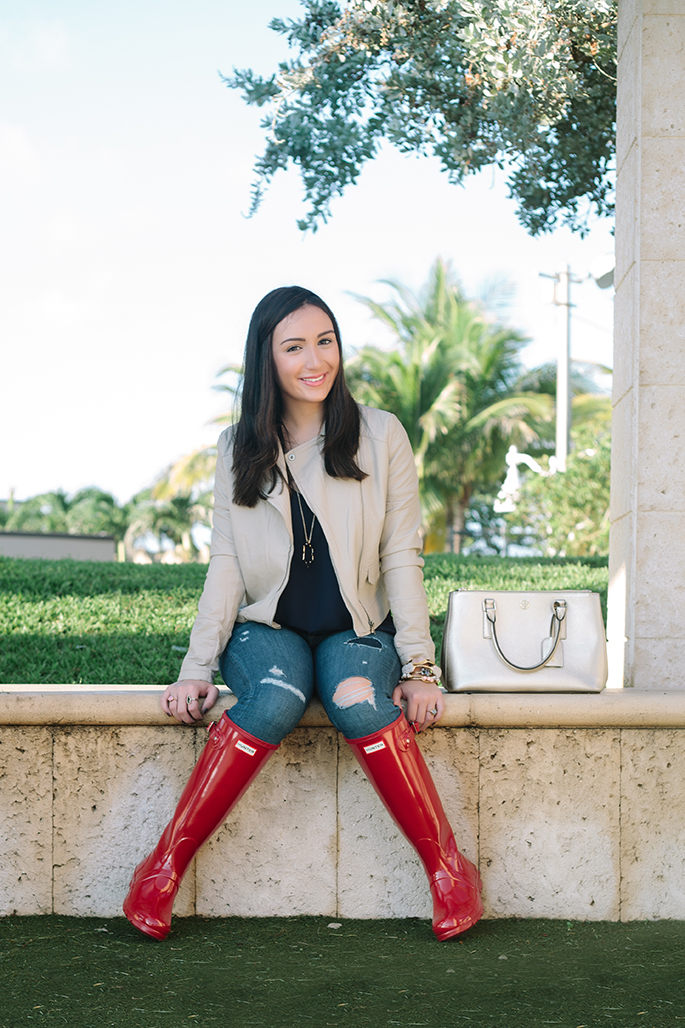 Top: Necessary Clothing (have it in every color!) | Jacket: Lulus (love this, this and this one!) | Denim: J.Crew (30% off this weekend!) | Boots: Hunter | Purse: Tory Burch (similar here and here) | Long Necklace: I Love Jewelry c/o (love this) | Short Necklace: TAudrey c/o | Bracelets: H.M. Willow | Rings: Wrenn Jewelry c/o, Kendra Scott