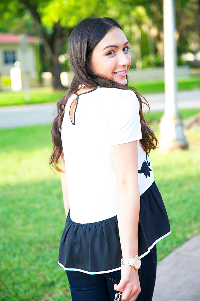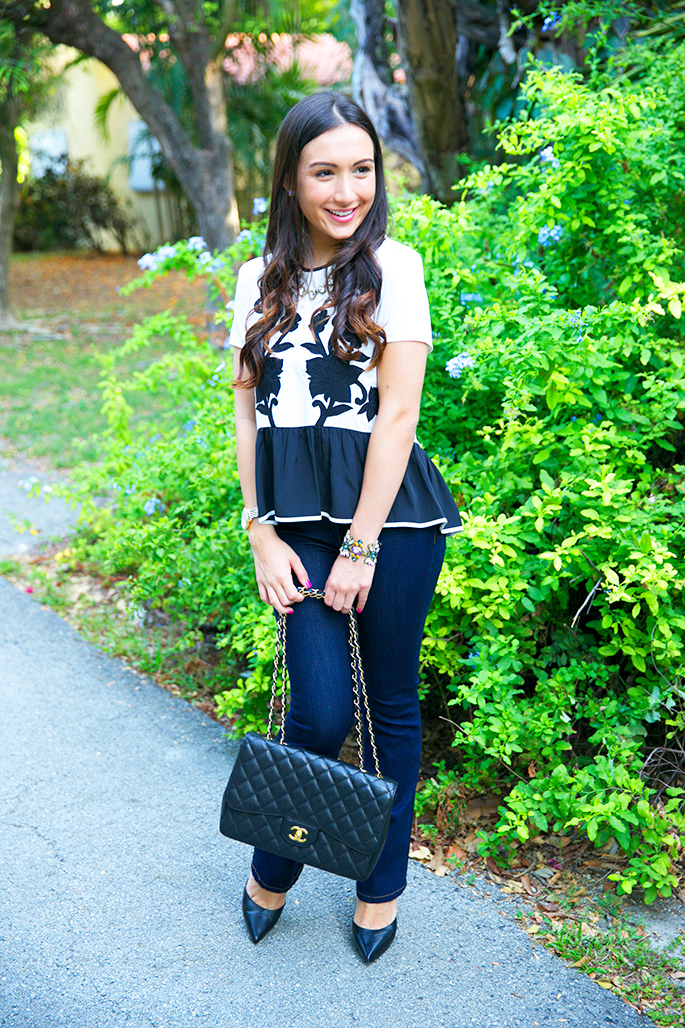 I dressed up my denim with a peplum blouse, a thinner statement necklace and some black pumps. I love denim because of it’s versatility. One day you’ll see me slouching in a big sweater and boyfriend jeans and another day you’ll see me all ready to go for a girl’s night out on the town. I opted for the darker denim because it tends to be slimming (or so I convince myself).