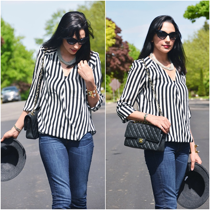 Sophie chose to dress up her denim with a faux wrap striped blouse and some ah-mazing jewels. I love that she didn’t overdo it with the jewelry. I like the simple touches of elegant pieces. And her sunnies… obsessed! She’s such a great blogger so make sure to check out her blog and give her some insta-love!