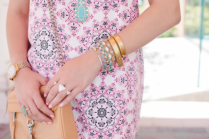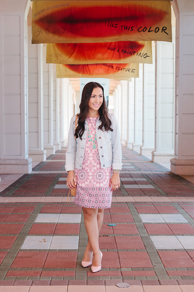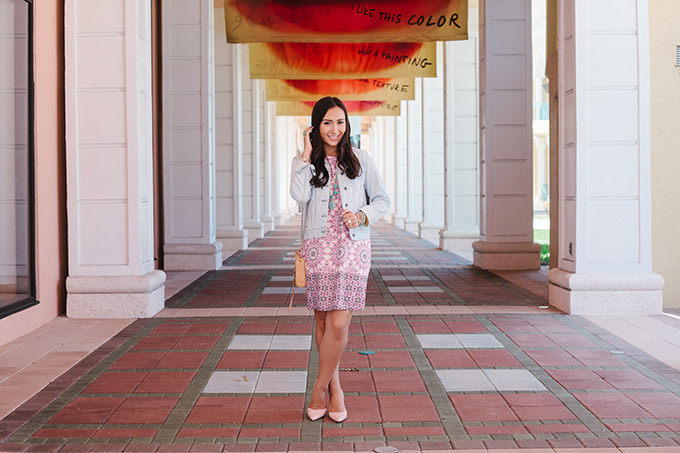 I love mixing different bright colors and patterns. This Everly pink printed dress is so classic and it’s pink, so obviously I’m in love with it! Pink is my favorite color but I sometimes think it can be a little overdone in some clothing. But, this dress is absolutely perfect! It has a fun mixture of patterns and is the perfect length. For reference, I’m 5’3″. I threw on this great denim jacket over my dress to give it a more casual feel. It’s also a plus that this jacket is only $30 and comes in three washes!