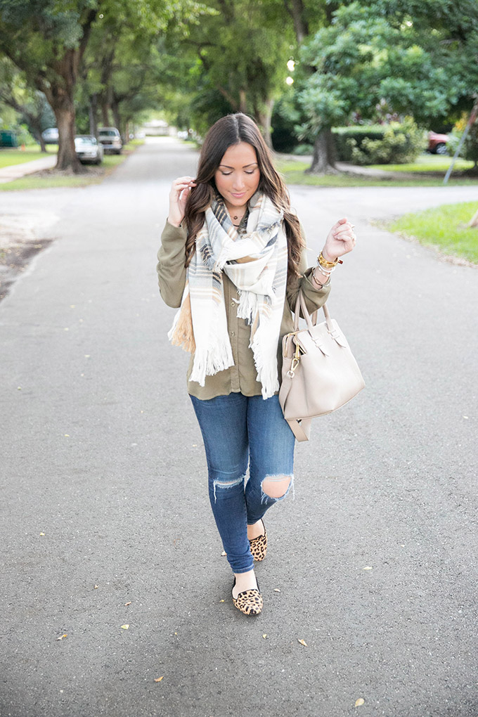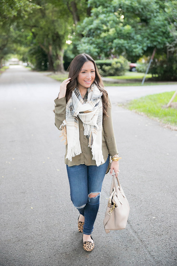 Today’s top is absolutely gorgeous. This olive top is a shirt tail button down and can easily be dressed up or down. I paired it with this gorgeous blanket scarf from ASOS, which is currently out of stock but you can see their amazing collection here.