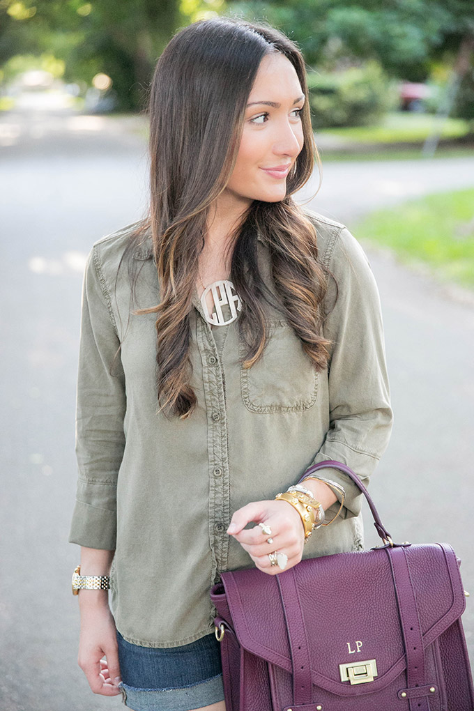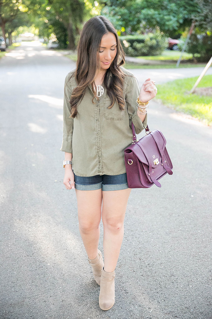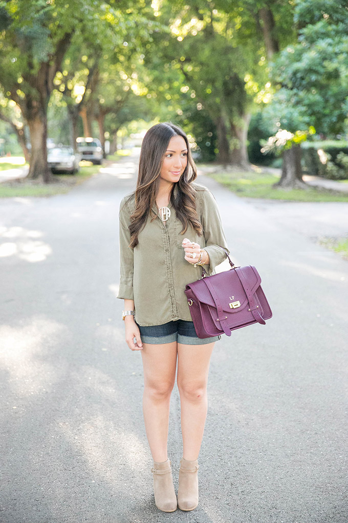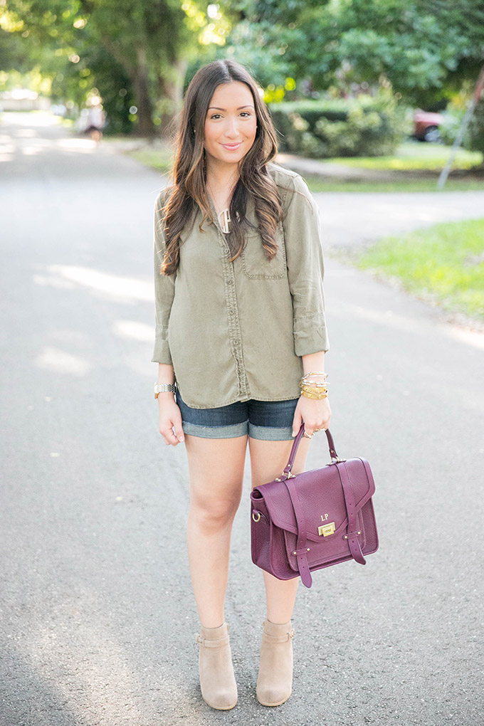 Yet another olive top… except this one is completely different! Bella Dahl comes in with a win today…again. This olive top is a little bit more casual compared to yesterday’s and can be paired with cuffed shorts, boyfriend jeans, and so much more. I paired it with a wine-colored handbag from GiGi New York because I love the way the two colors pair together. This is definitely a trend to try out this fall! What would you wear this olive top with? And you should feel it… SO soft! But that’s the case with all Bella Dahl things.