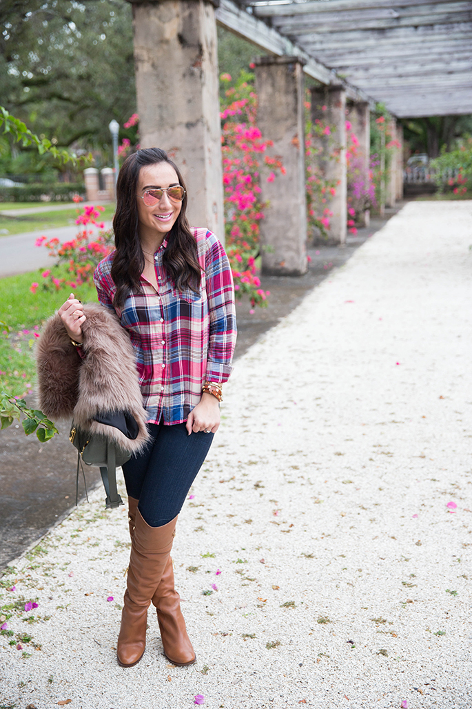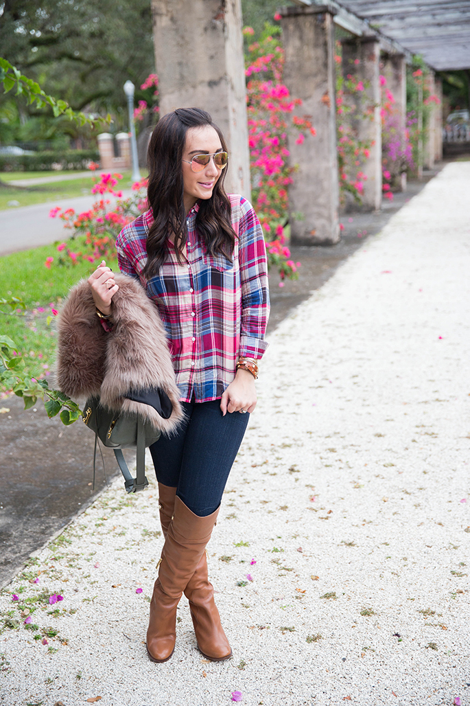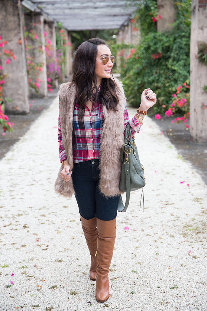 Happy Friday! I hope you all had an amazing New Year’s Day. Obviously, 2015 hasn’t changed the fact that I still am obsessed with plaid…haha! I paired my plaid top with my new faux fur vest, which is super comfortable. I love anything faux fur because it instantly adds glam to any outfit. I am pretty petite (barely 5’3″) so it’s pretty long on me but if I wear a top that sits higher or is tucked in, I can get away with it. I’m so sad that these OTK boots are sold out but I’ve linked some similar ones below for you!