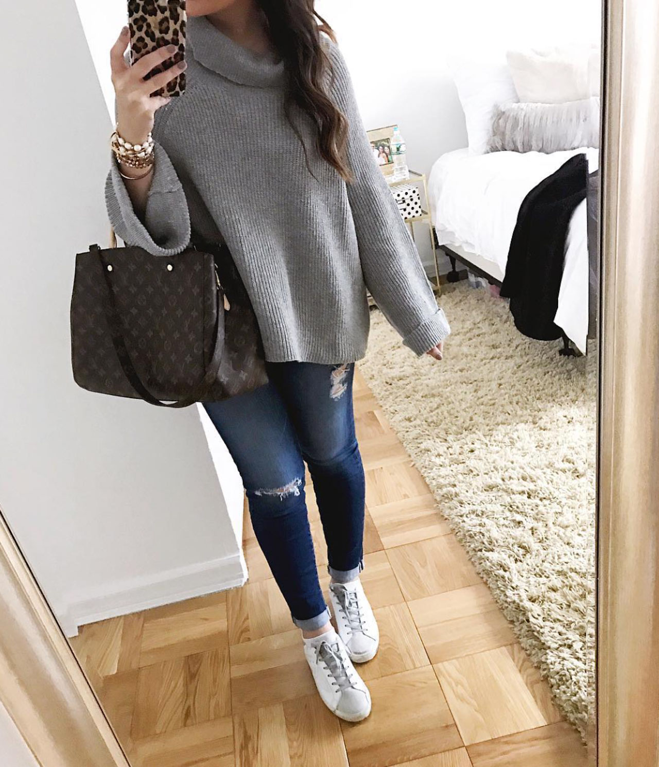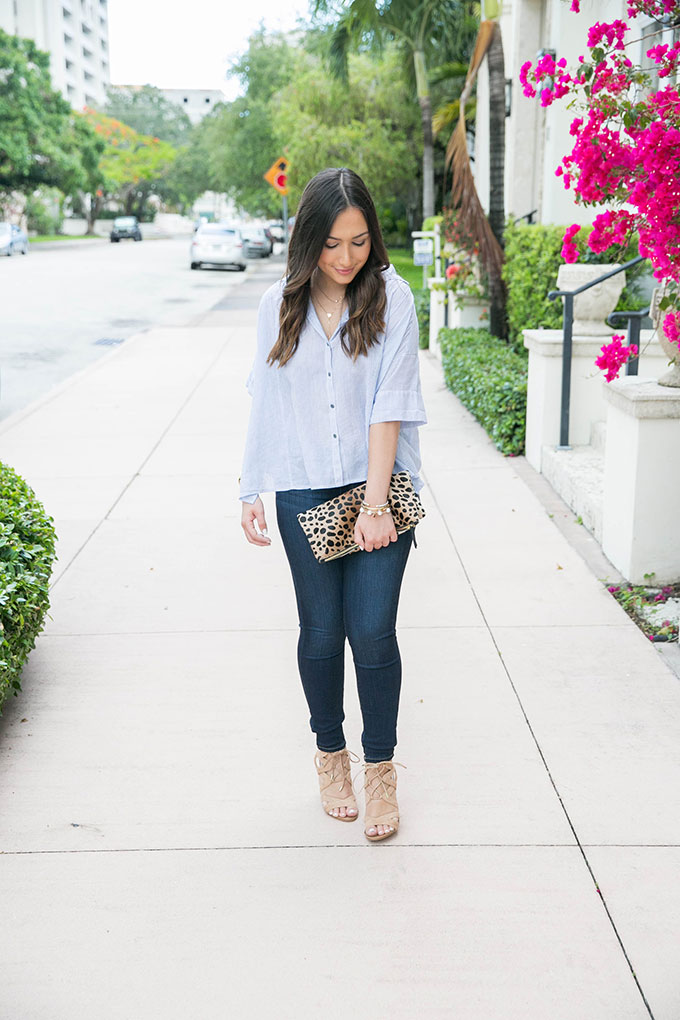 Express Jeans are amazing! They are also at such a great price point yet they fit so amazing. I used to do the “S” for short, but now I just do the regular jean if I’m doing a jean like above that has a frayed hem. Jeans like these are so great and flattering and work well during any season. Their ankle jean leggings are some of my favorites and fit like a glove, too. If you’re looking for jeans in a lower price range but still great quality, these are it. These are the ones I’m wearing above in grey and I swear by them! I wear a size 8. I also love these girlfriend jeans.