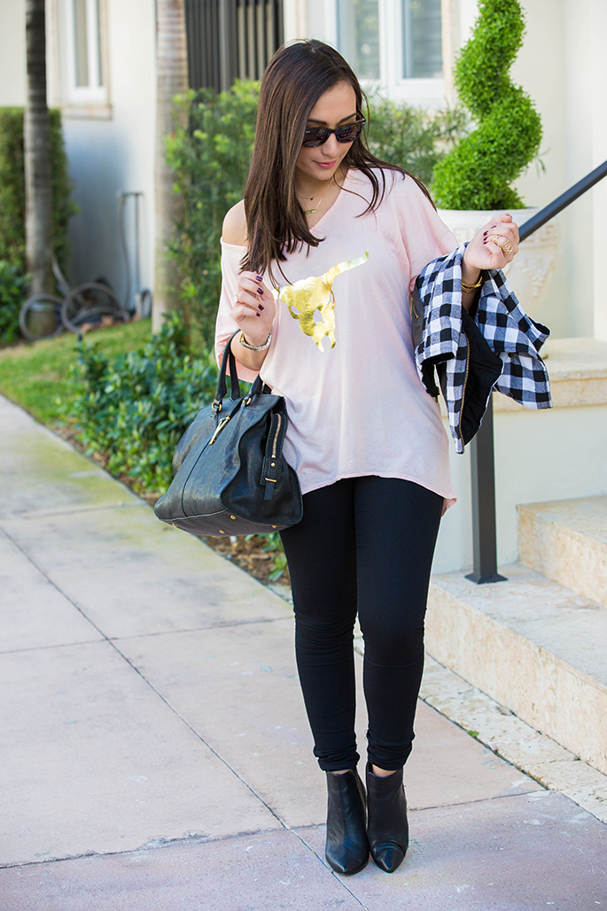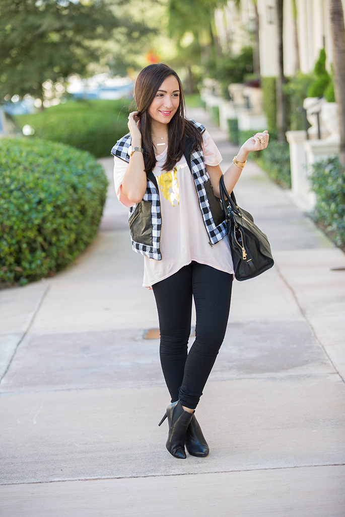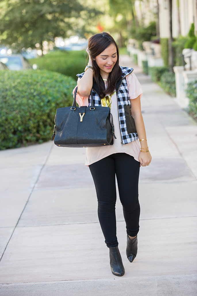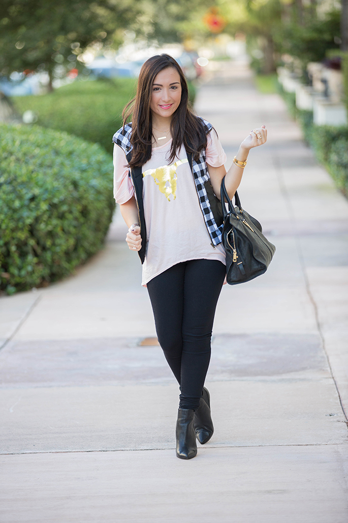 Southward Apparel longhorn tee c/o | Monica’s Closet Essentials plaid vest c/o use code ‘fashionista10’ for 10% off entire purchase | East & Lo black jegging [fit: size down] c/o | Joe’s Jeans via Piperlime booties c/o | YSL purse | Lola James smitten and alter ego necklace c/o | Gorjana tegan cuff via Rocksbox c/o | Lola James finishing touch and fearless bracelet c/o | Wrenn Jewelry druzy ring c/o | t+j Designs midi full finger ring | Ray-Ban folding wayfarer sunglasses | Michele gold serein watch | Chanel rouge coco lipstick in triomphe