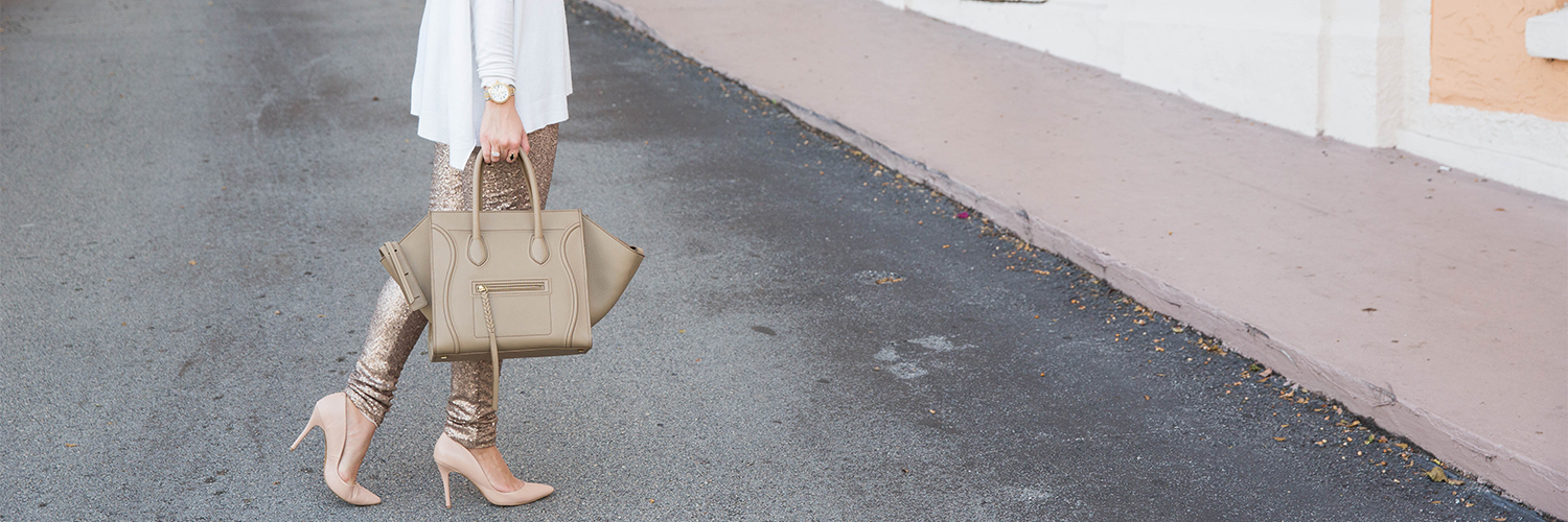 Avery Lane Boutique Sequin Leggings c/o | Olivaceous White Sweater (old, similar here and here) | Celine Purse | Charles by Charles David Pact Pump | Accessory Concierge Layered Necklaces c/o (love this one too) | Kendra Scott Rings | Michele Gold Serein Watch | Urban Decay Lipgloss in Lovechild