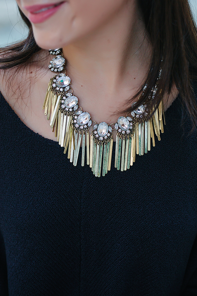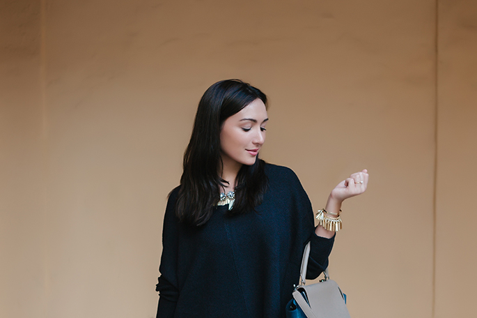 Sweater: Habit (similar here and here) Skirt: Habit (similar) | Shoes: Michael Kors (on sale!) | Purse: Celine (love this color) | Necklace: BaubleBar | Bracelet: BaubleBar | Ring: BaubleBar | Watch: Michele | Lips: Mac Chatterbox