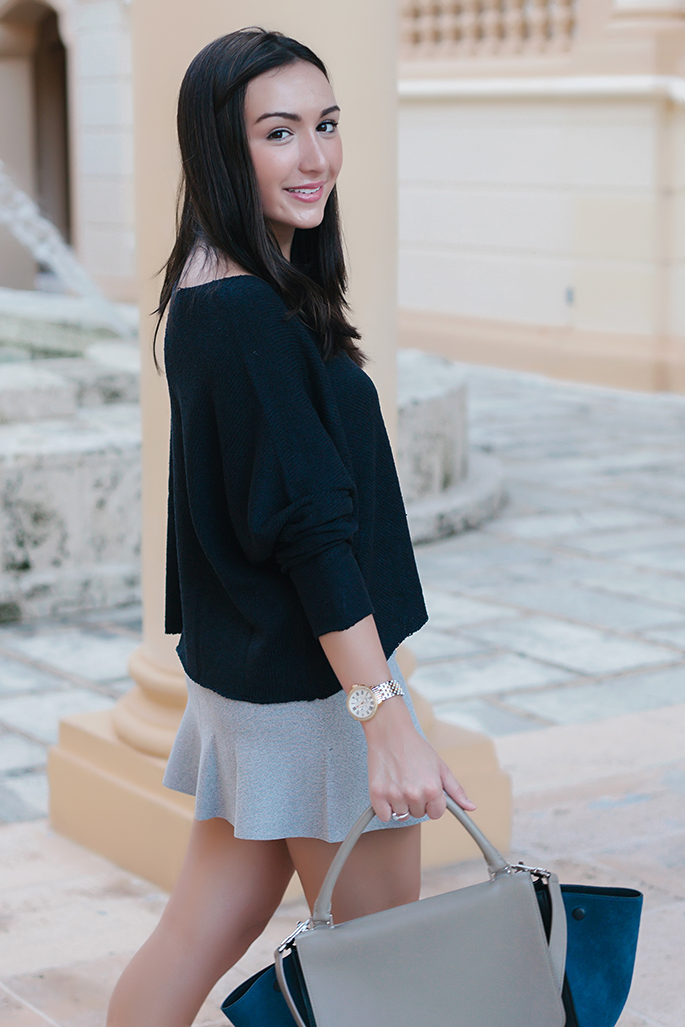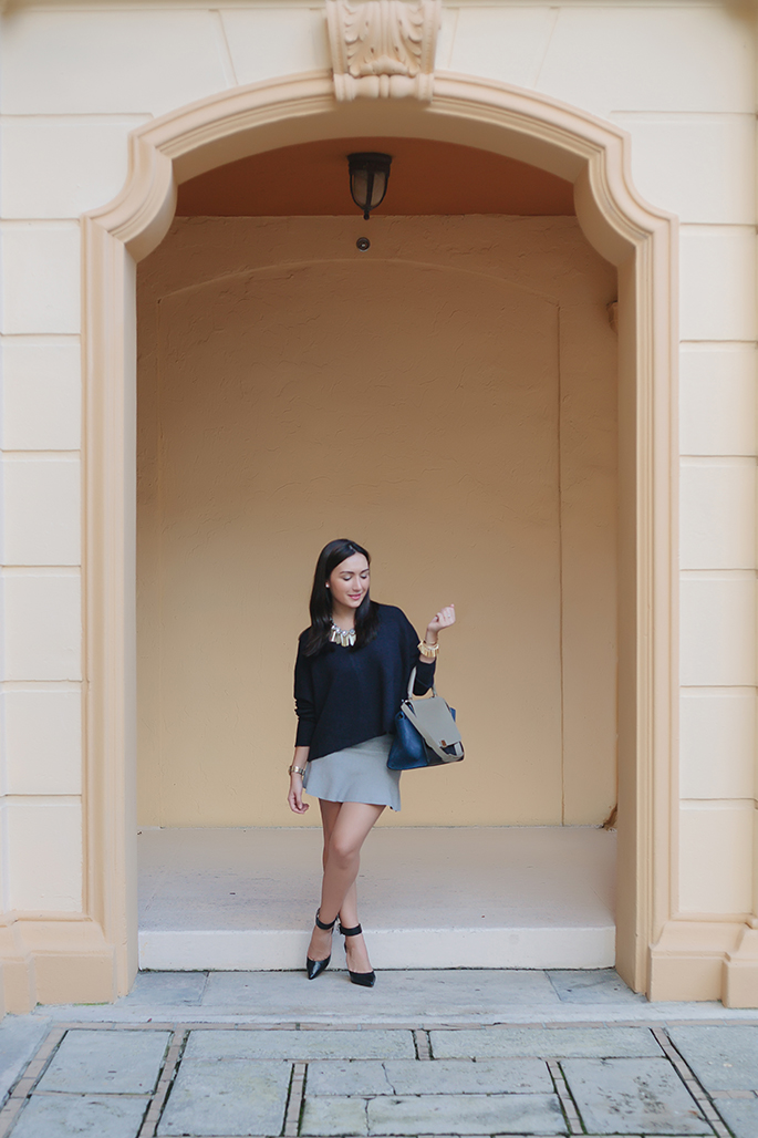 It may be hot in Miami but I couldn’t pass up wearing my new chunky sweater and gray skirt. I love this neutral combination and, even though I never wear gray, I really love the color of the skirt. This could easily be dressed down with flats and a long necklace or dressed up, as I have it! What do you think? How would you wear it?