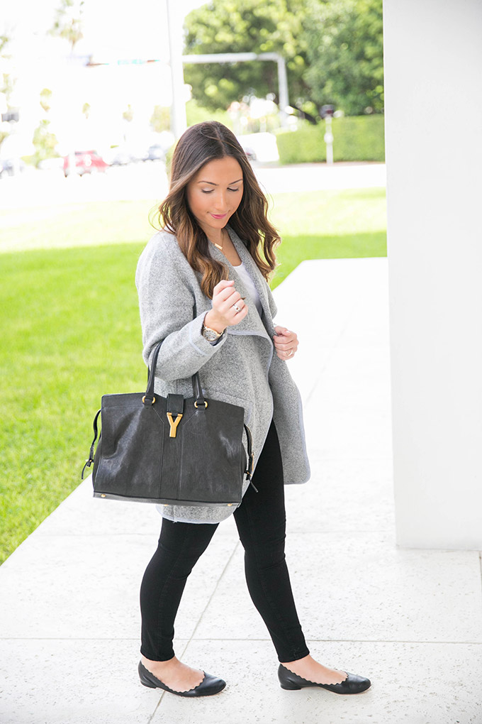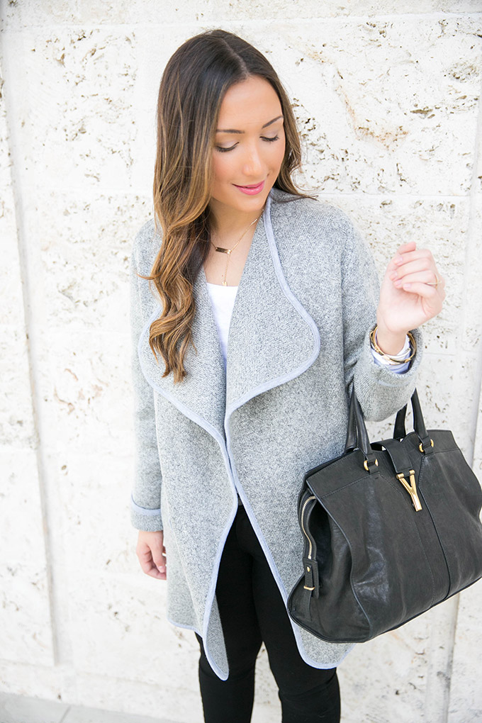 If you are looking for the perfect open knitted coat, this one is perfect for you. And, even if you weren’t looking for it, now you know you need it! This gray knitted coat is so perfect for fall and even winter. It looks like a coat but is so soft like a cardigan. I really don’t like when coats are super stiff because then I feel uncomfortable. This one is absolutely perfect! It’s soft, cozy, comfortable and versatile. It can be worn over a dress or over a simple tee and jeans (like in this case). The price tag is also great for a piece that you will wear many times and for many seasons to come!