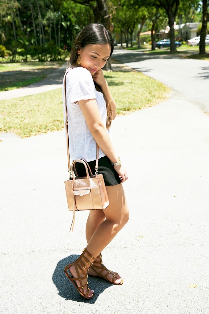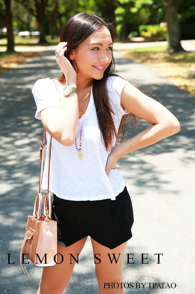 Top: James Perse | Skorts: Necessary Clothing | Shoes: Tory Burch | Necklaces: Blue Moon Designs, Taudrey | Earrings: Lemon Sweet Jewelry c/o | Bracelet: Lemon Sweet Jewelry c/o | Watch: Michele | Purse: Rebecca Minkoff | Lips: YSL Kiss and Blush #9