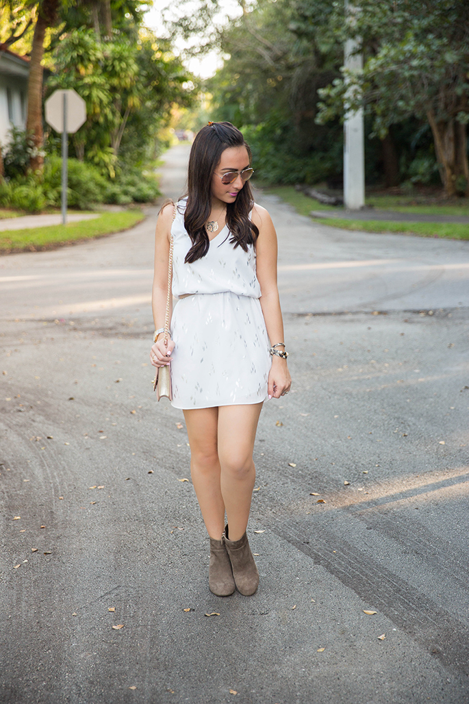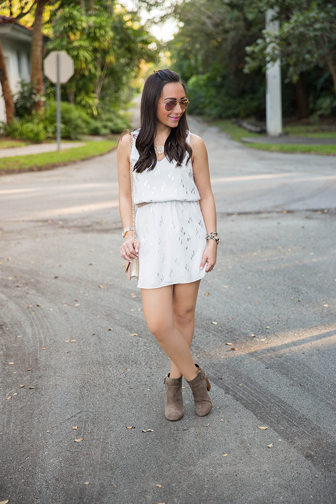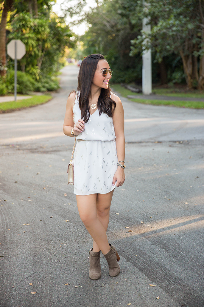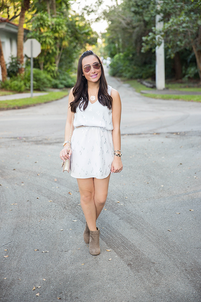 Everly Clothing White Dress c/o (I also love these dresses by Everly Clothing 1. 2. 3.) | J. Crew Skinny Belt | Tory Burch Booties (no longer available but these are very similar…an extra 25% off sale styles with the code ‘newyear’ + there are also a ton of booties here) | Tory Burch Kira Cross-body | Ray-Ban Aviators in Brown/Pink | Tory Burch Triple Wrap Bracelet (on sale for 33% off!) | Monogram Necklace is old, similar here, which I absolutely love! | Sowinski Jewelers Ring (similar here and here) | Michele Gold Serein Watch | YSL Lipstick #26