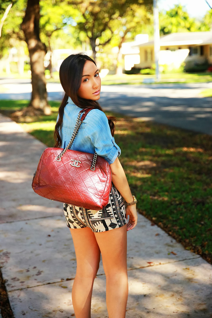 Top: Bella Dahl (similar) | Shorts: Habit Boutique | Shoes: Chanel Ballerina Flats (similar) | Necklace: Anthropologie (similar) | Bracelet and ring: David Yurman | Watch: Michele | Lipstick: YSL Rouge Volupte Nude Beige | Purse: Chanel Burgundy Bowling Bag c/o Consign of the Times