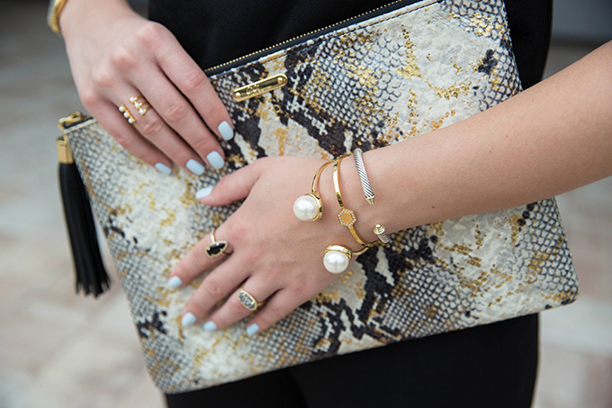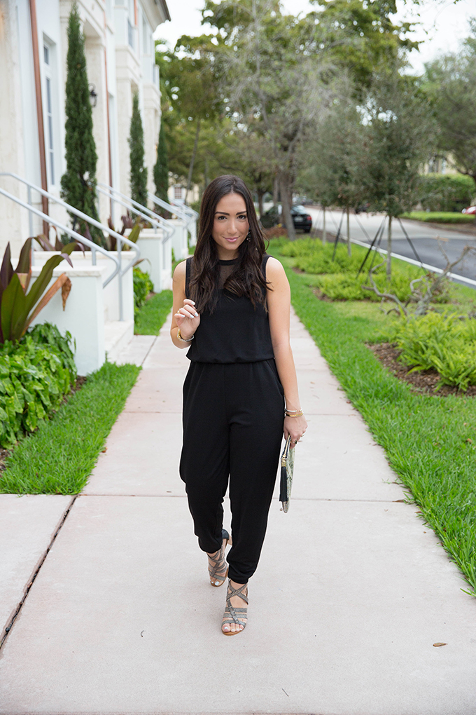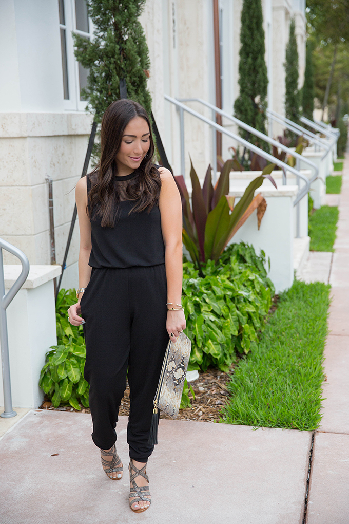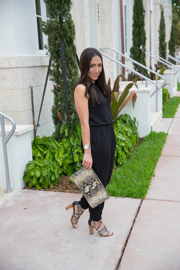 Today is part one of a two-day series where I’m going to be dressing up, then dressing down this black jumpsuit from Maggy London. It’s so easy to dress up a jumpsuit and I love how effortless it is to do so. Since this black jumpsuit has a mesh neckline, I decided to go with statement earrings, rather than a statement necklace, and added in my favorite print ever – snakeskin! I recently bought these heels and thought they would bring a great pop of print to this ensemble and it just so happened that they went perfectly with my clutch. I think snakeskin is such a great print for going out at night or whenever you want to kick things up a notch.