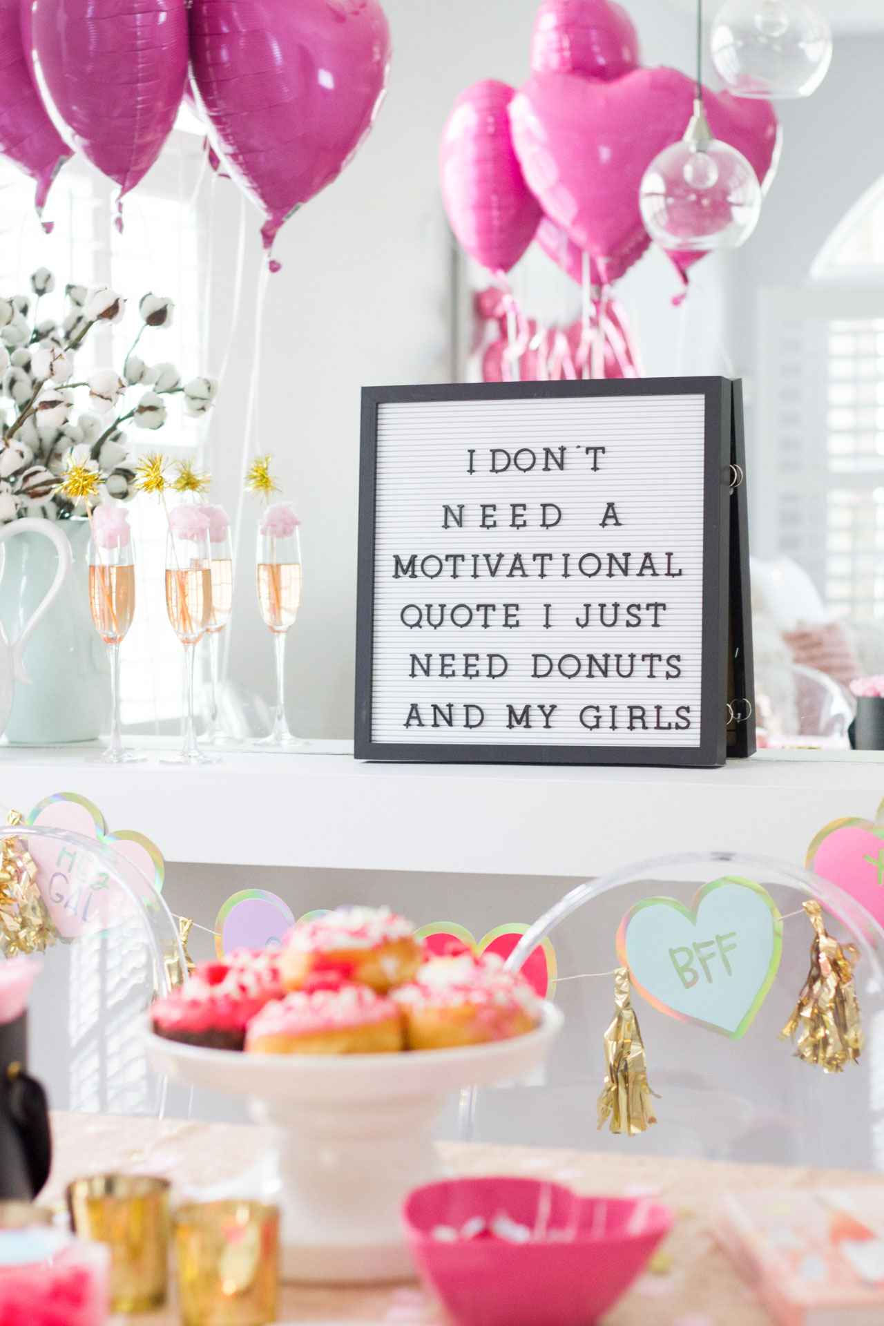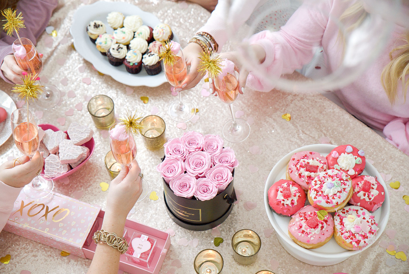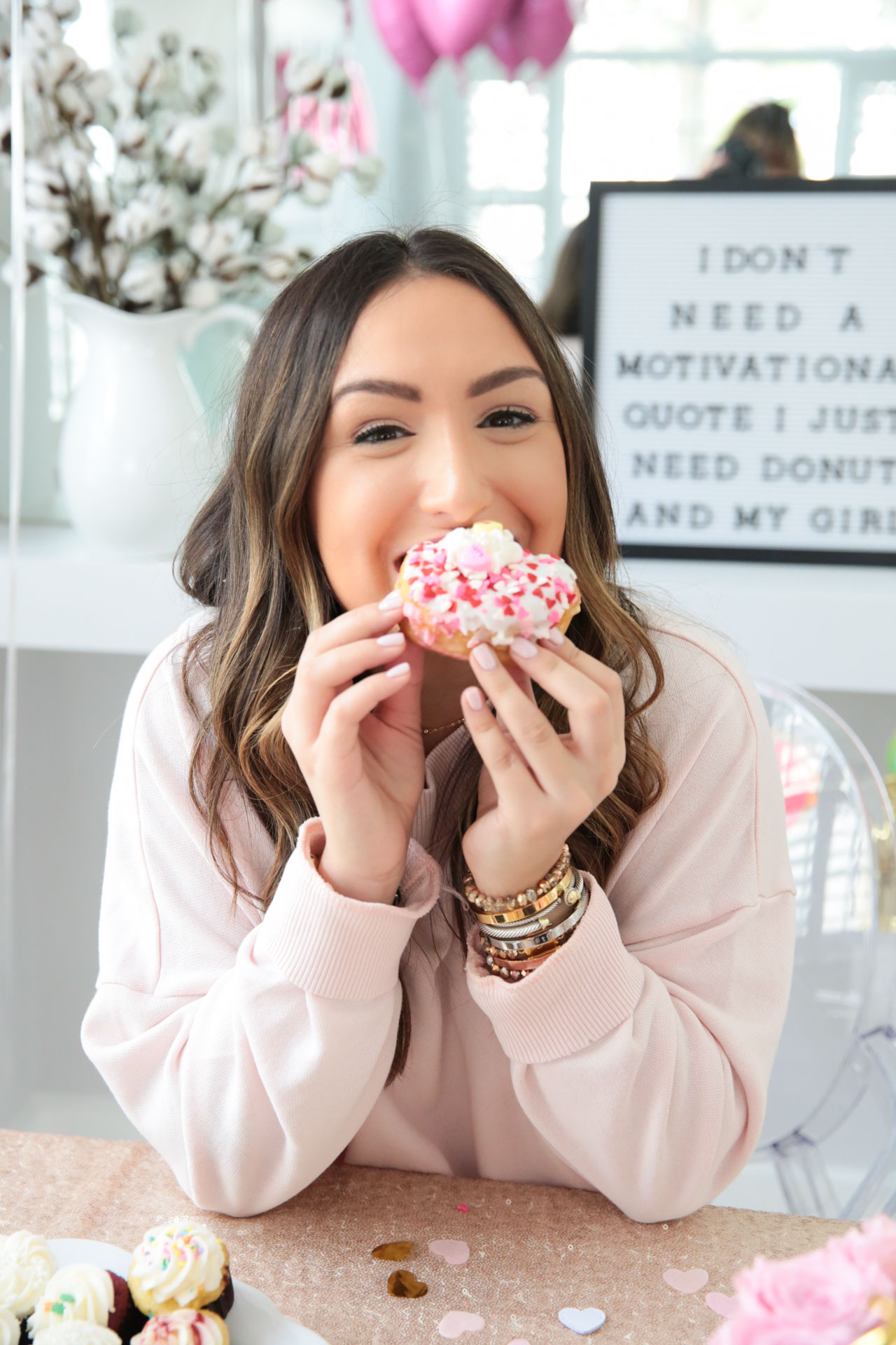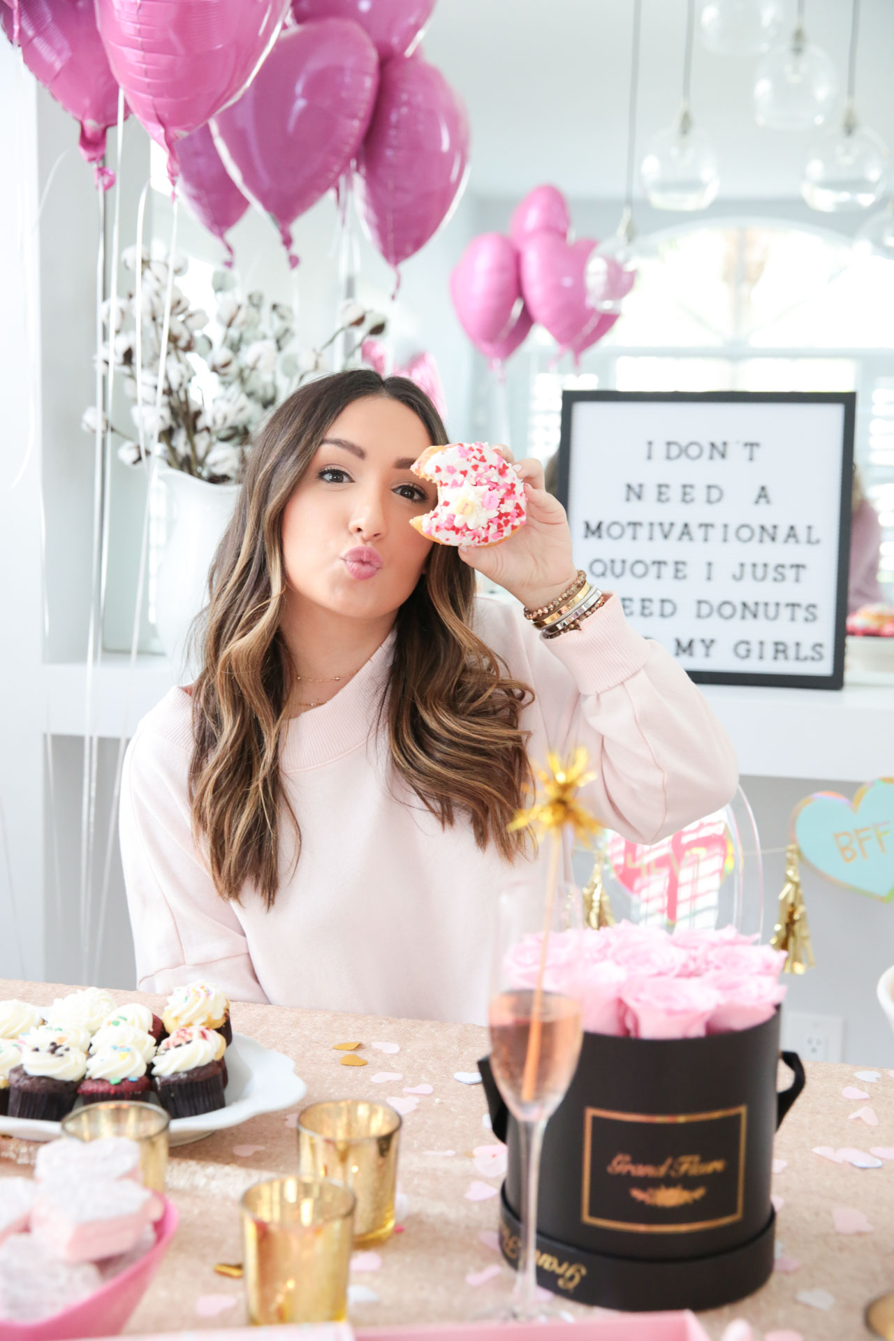 It’s all about decor. Kristin has a gorgeous house so it was easy to bring in some pretty Galentine’s Day decor to really set the tone. We brought balloons, confetti, yummy treats, coffee table books and more and it made the house so much more… Galentine’s-y (not a word – I know). Even if you’re just spending the day together celebrating the holiday, decor can make or break your mood and also helps get some really cute photos. Split up the decor responsibilities amongst you and your friends and soon enough you’ll have a themed Galentine’s Day house! For snacks, we had everything from Hershey’s kisses to Misha’s cupcakes, Jupiter Donuts, Sugarfina snacks, cookies and pizza! It’s safe to say we were all on a sugar high for a while afterwards.
