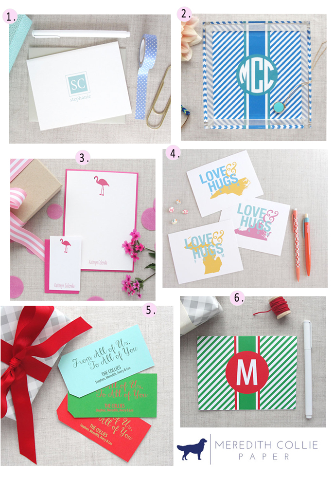 There’s nothing I love more than good stationery. As a blogger, I’m always writing things down and I most definitely always want to feel inspired and motivated. I’m so excited to have these great items from Meredith Collie in my blog office. Her shop, which offers stationery, gifts, invitations and more, is a mixture of girly, fun and sophisticated all in one. What I especially love about Meredith, the shop owner, is that she gives back and makes her pieces have meaning. For example, the “She who is Brave is Free” print and pencils are a part of the Flamingos For a Cure collection, which focuses on honoring those battling with cancer and donating 20% of proceeds towards finding a cure for cancer. Truth is, we’ve all been impacted by cancer. I’ve lost many family members to it, and I know many friends that have lost theirs, too. The flamingo symbolizes a sense of community, and that’s what you’ll become a part of when you purchase an item from this collection! It’s probably my favorite part about this shop. Not to mention, the amount of beautiful custom stationery, tags and lucite trays are definitely swoon-worthy. I’ve made a collage below with some more of my favorite items from the shop! There are so many great items, especially now that the holidays are quickly approaching. 🙂 Meredith_Collie31. 2. 3. 4. 5. 6.