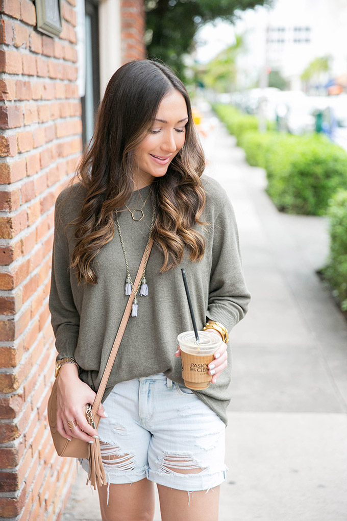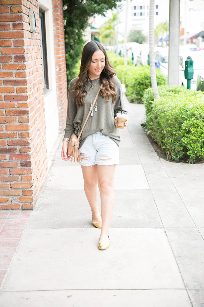 Since it doesn’t get too cold, I can definitely still wear shorts all throughout fall and winter. But, to add a fall touch, I like to wear comfortable sweaters, like this one. I posted this sweater last week (here) and told you that I had it in three colors. Well, I wasn’t joking! This sweater is honestly so comfortable and I’m thinking about also getting the navy. I love the cut, the feel and the coziness of it. I’m a sweater hoarder, but this one is definitely in my top three!
