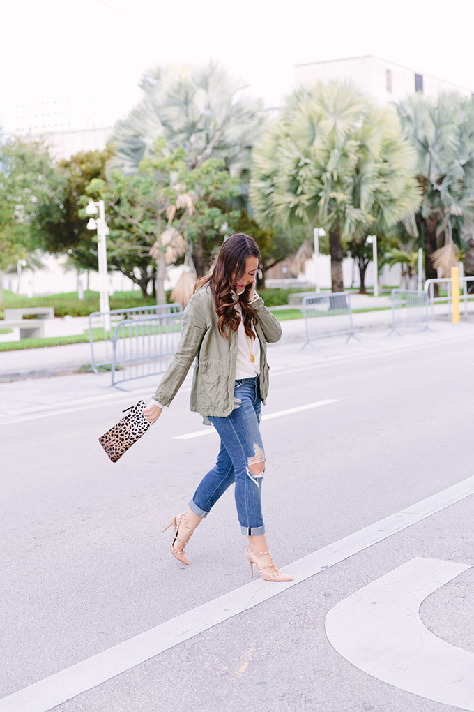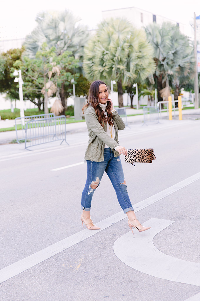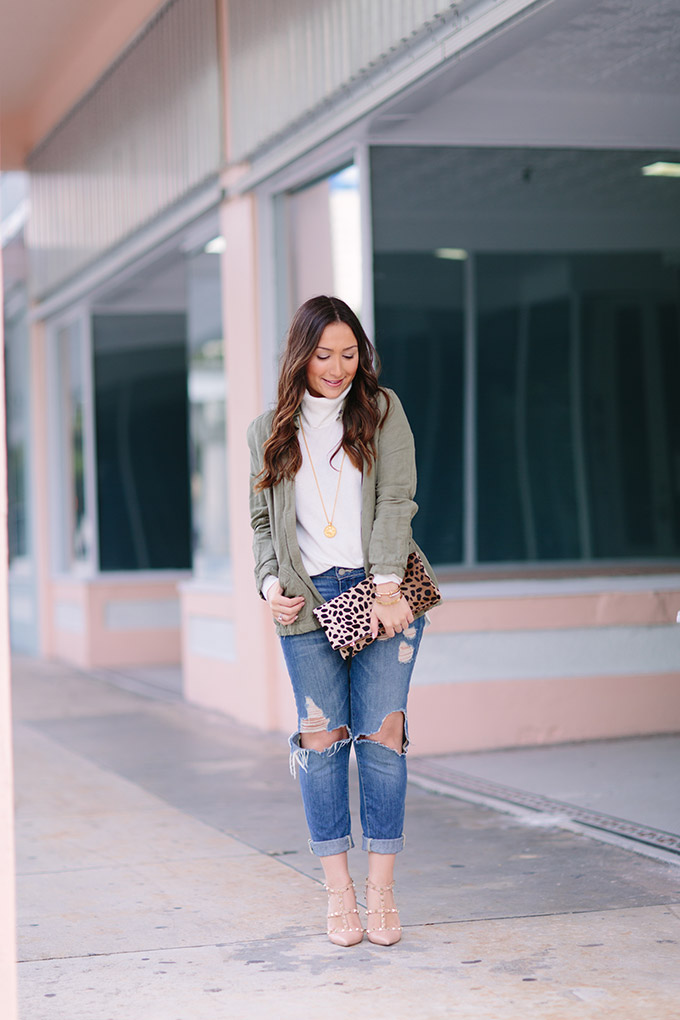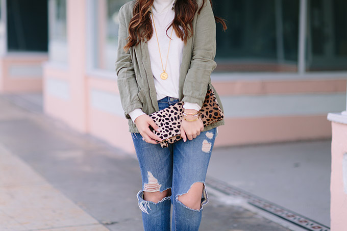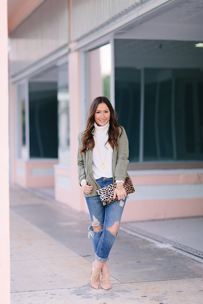 Happy Monday! I hope you all had a great weekend. I’m wearing my number one favorite utility jacket EVER today. This olive green jacket has been on repeat in this color and the gray color. I seriously love it. Also, this turtleneck is a must-have. It’s a little pricey but so worth it. I might buy another color before going to New York on Friday (yay!). It lasts forever and wears really well. Olive green and ivory is a classic combination and adding in some leopard just makes it even more fun!