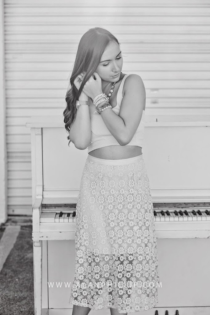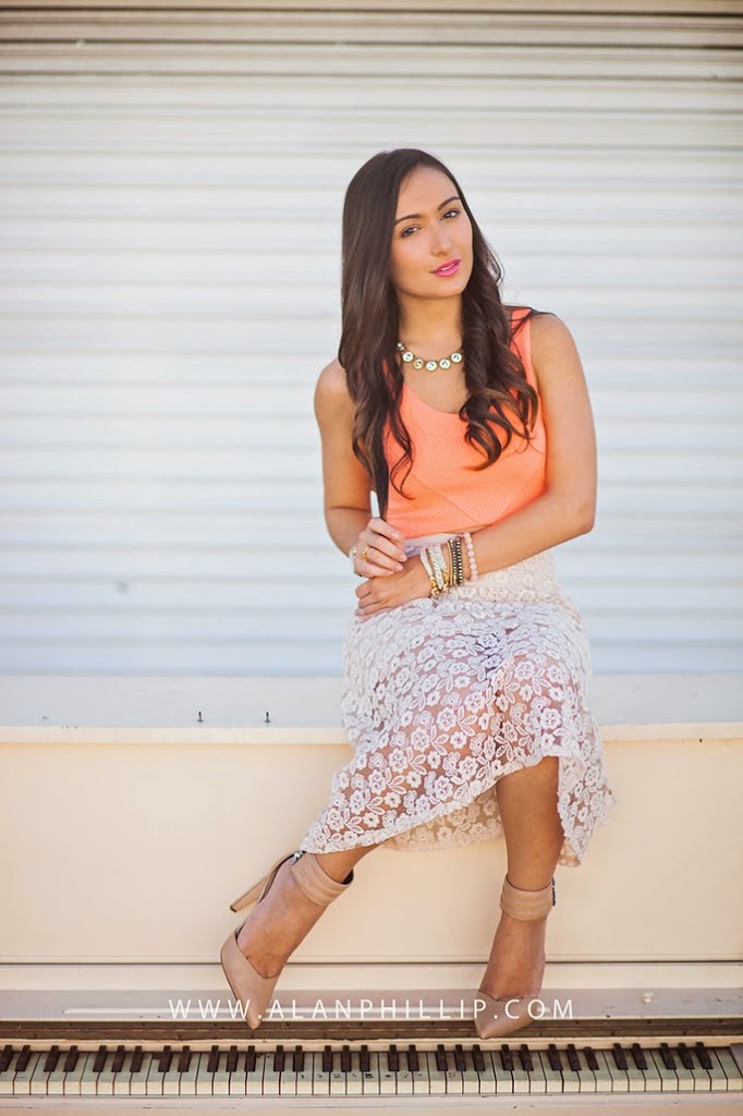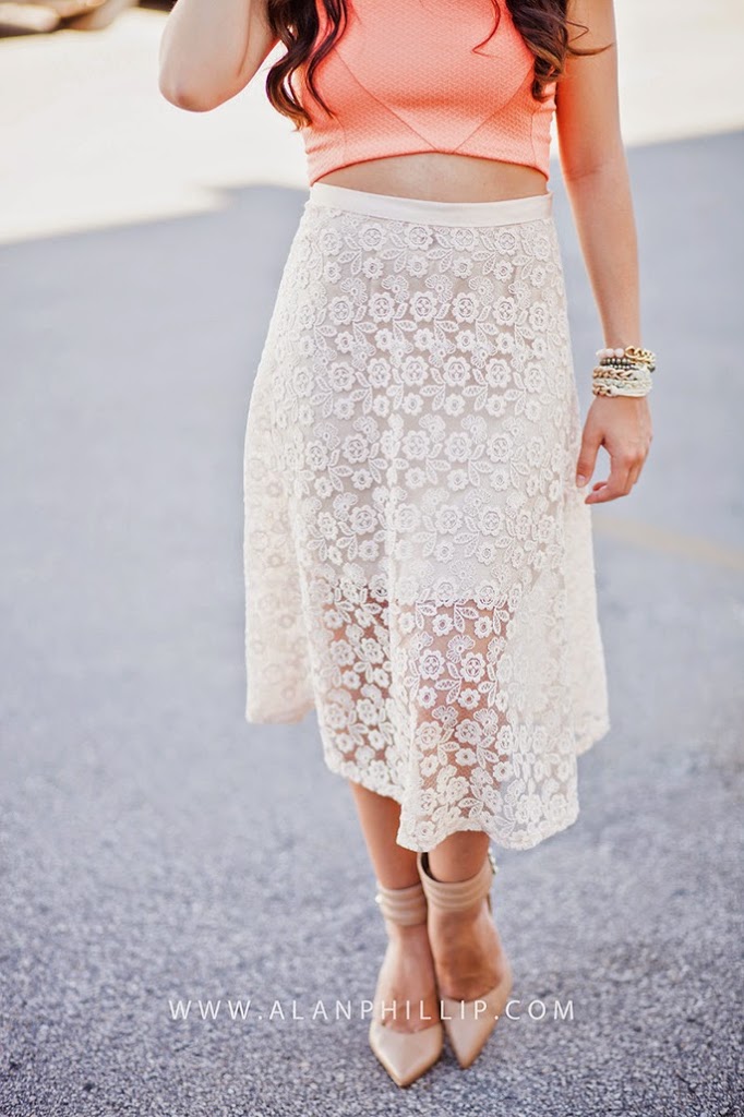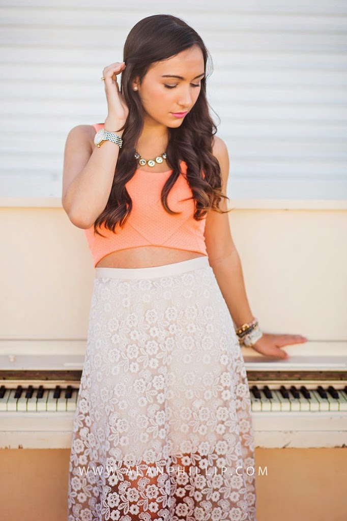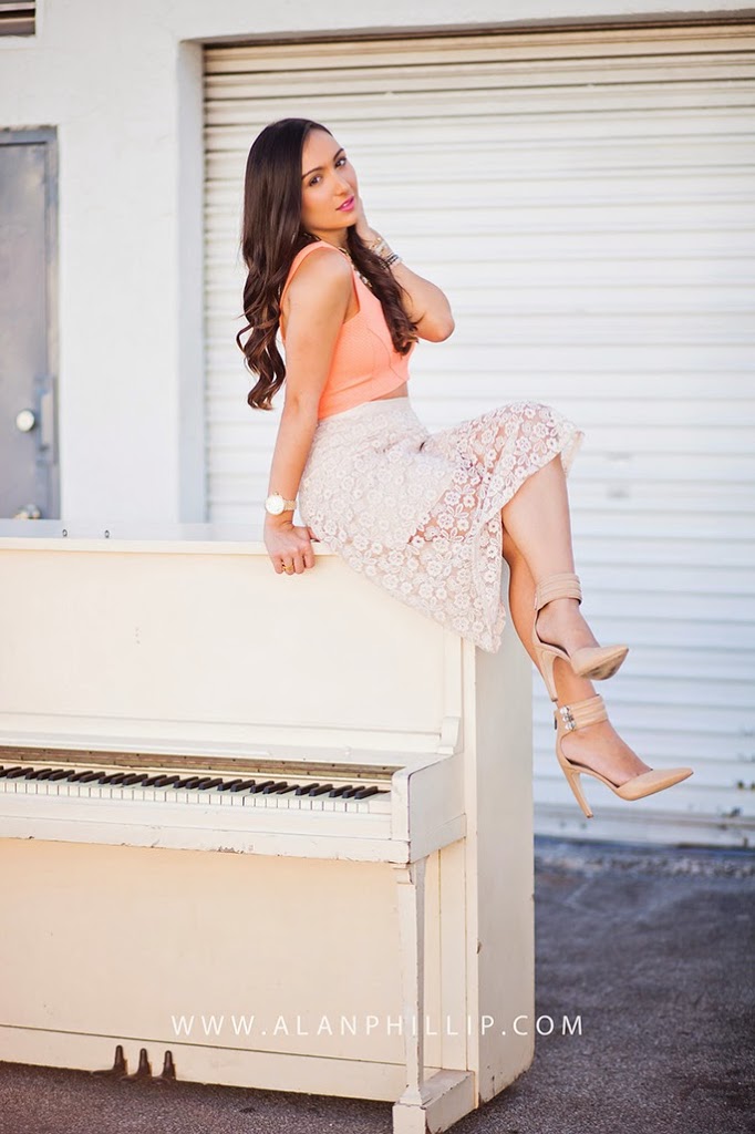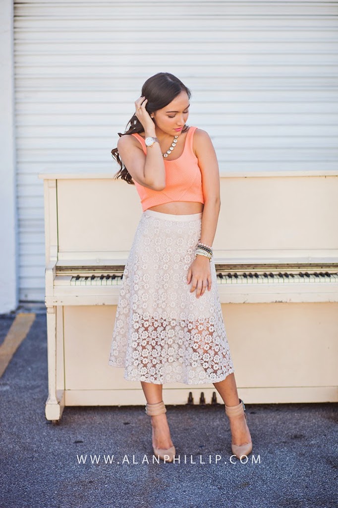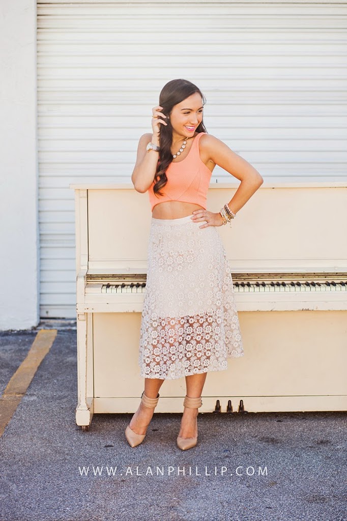 I’m loving the crop top trend that has really taken flight this season! I never truly felt confident about wearing a crop top, just because I’m a little more conservative when it comes to that. But I thought that pairing this crop top with a beautiful lace midi skirt would really give it that classic feel without going overboard with the shorter top! I think it’s all about balance. 🙂 If you’re going to wear something tighter/shorter on top, wear something flowy or longer on bottom! I loved shooting with this vintage piano because it gave it that old-fashioned look, which is something the midi skirt reminded me of to begin with. This is my first midi skirt, ever, and I love it! I’m only 5’3, which intimidated me at first, but that’s why I added some nude pumps to the ensemble (you know, a girl needs any added height she can get). This week, I challenge you to try out something new. Maybe it’s the crop top trend, or something completely different. But take that risk and try it!
