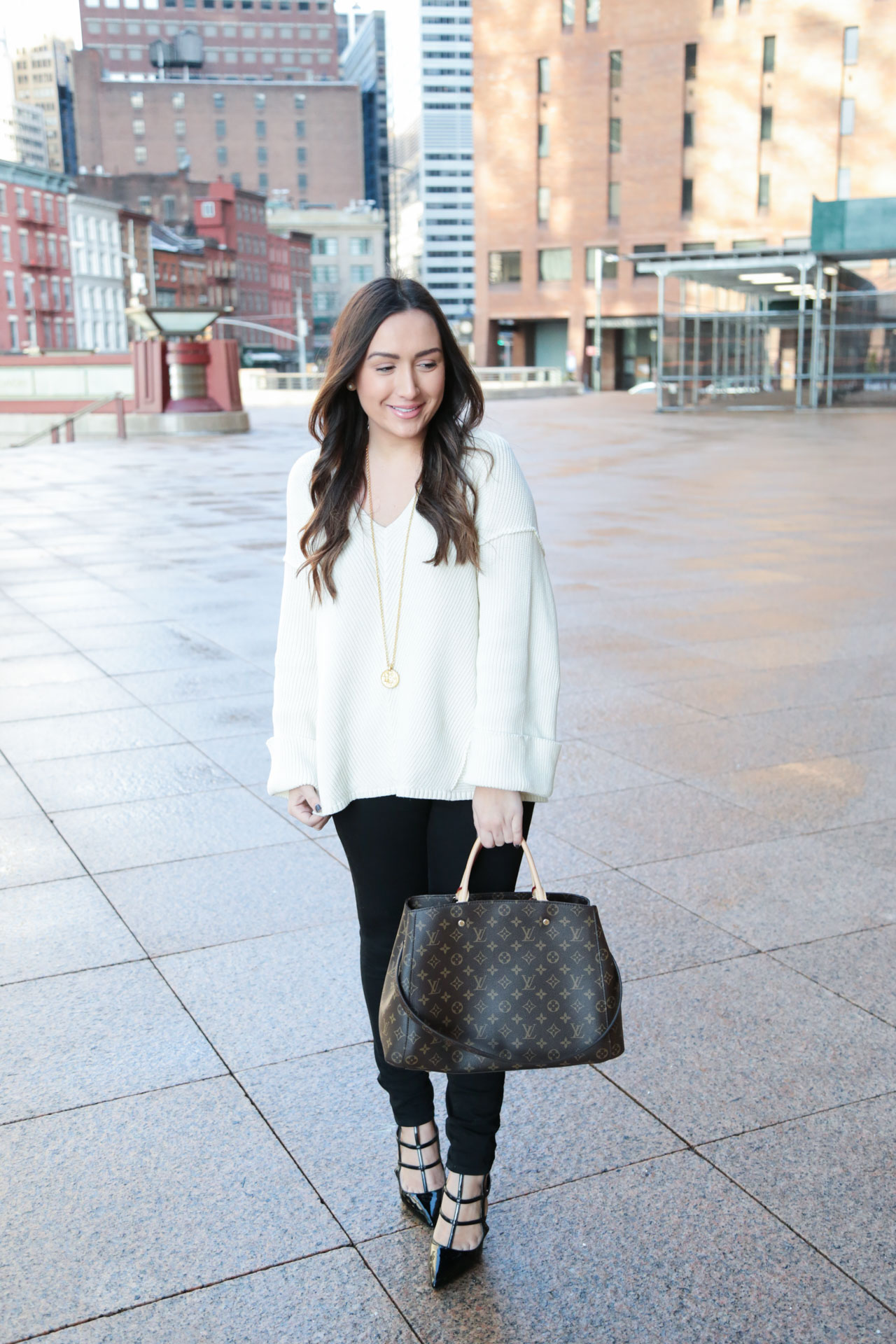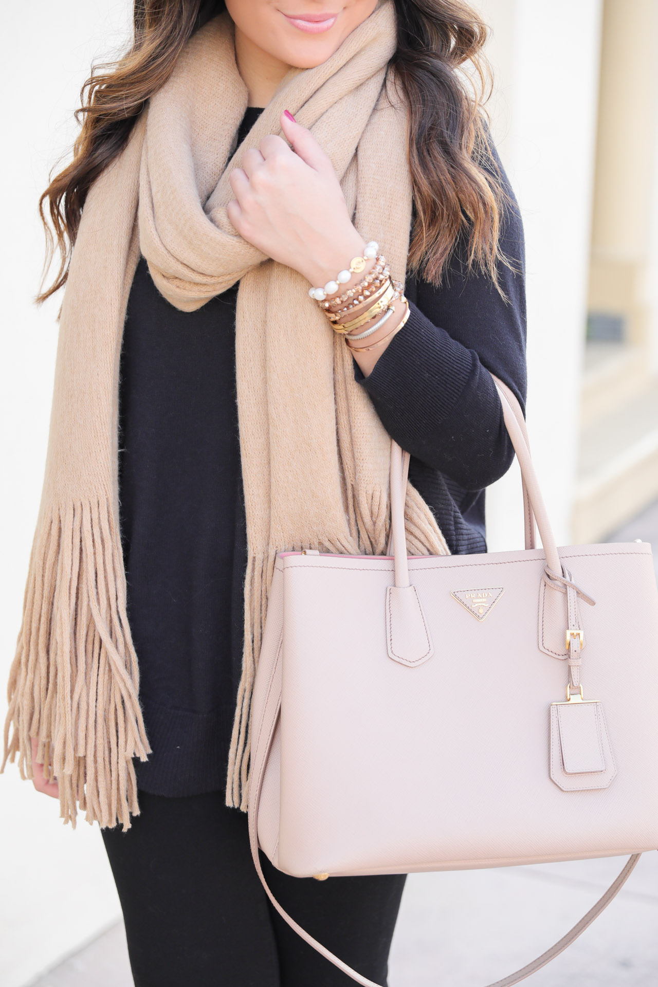 Two things in this photo are in stock. First up, this scarf; I wore it a lot last year and especially in New York. It also comes in a striped version now, which is BEAUTIFUL! I don’t think a lot of people know about the striped version, yet. But I think I’m going to get it and style it for you! The next up is this sweater, which is the same one as above but in black and in a size small.