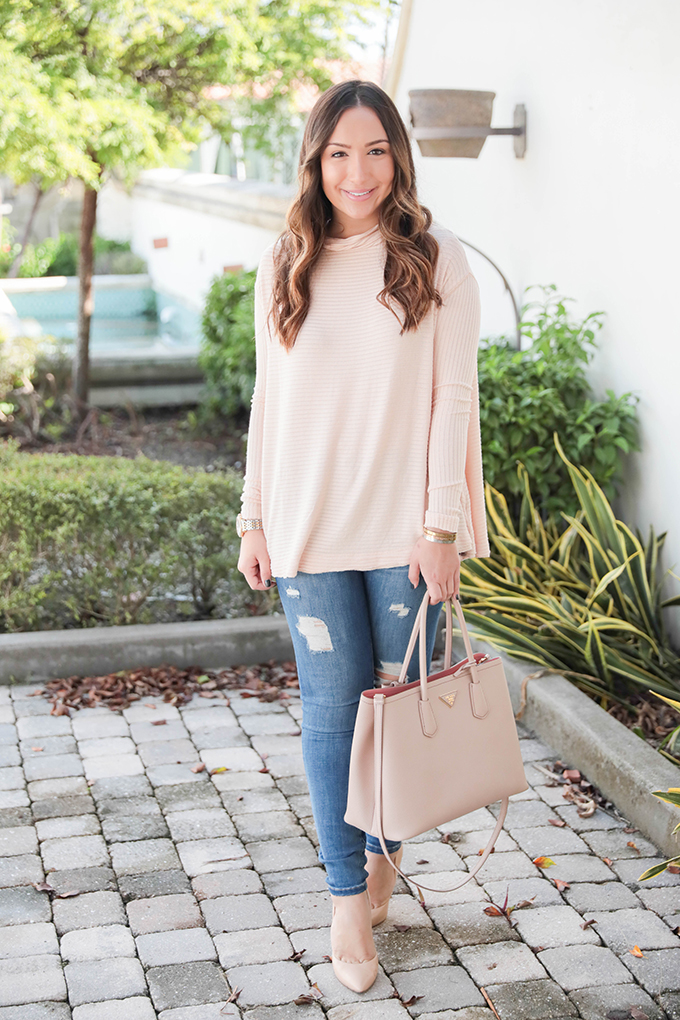 This sweater from LOFT was one of my favorites and they’ve come out with one this year that is basically exactly the same (I purchased it and will style it on the blog next week!). You can get 50% off right now with code MYSTERY50. It comes in 3 colors but I got the blush, of course. Haha! It’s perfect with white jeans, darker jeans, leggings, you name it.