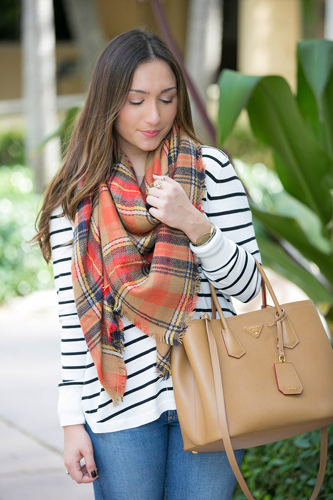 Last but certainly not least, this striped V-neck sweater. I remember when this first came out last year I was in love. And I still am! While this color combo is sold out, there is navy/white and black with white stripes still available!