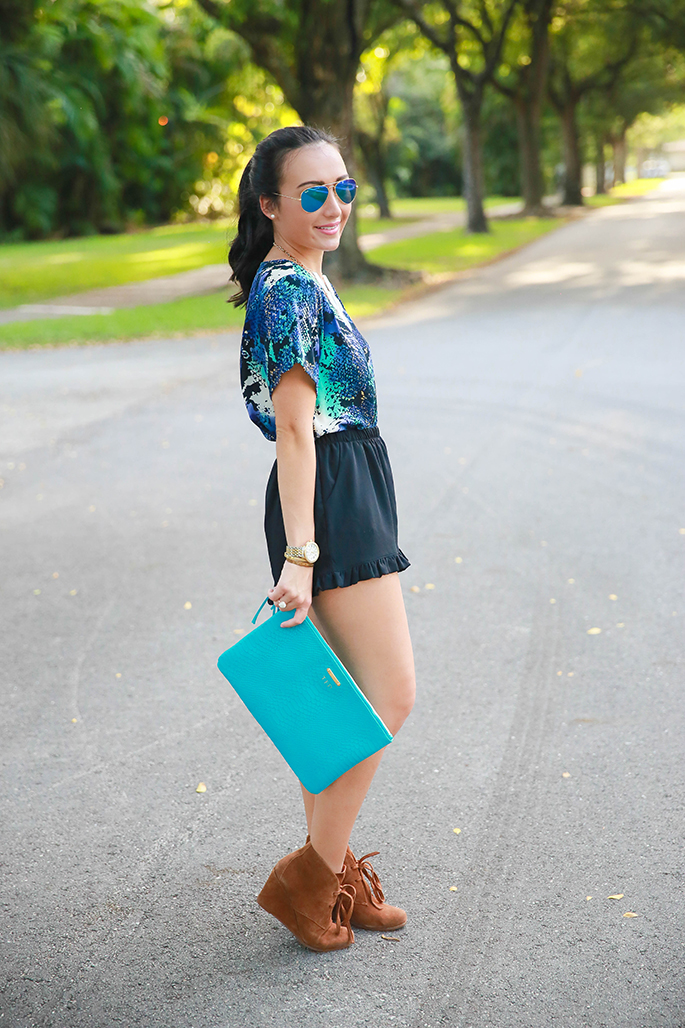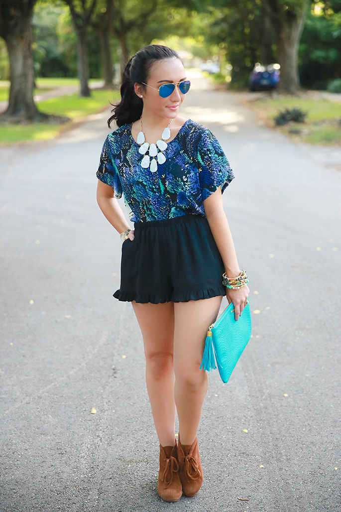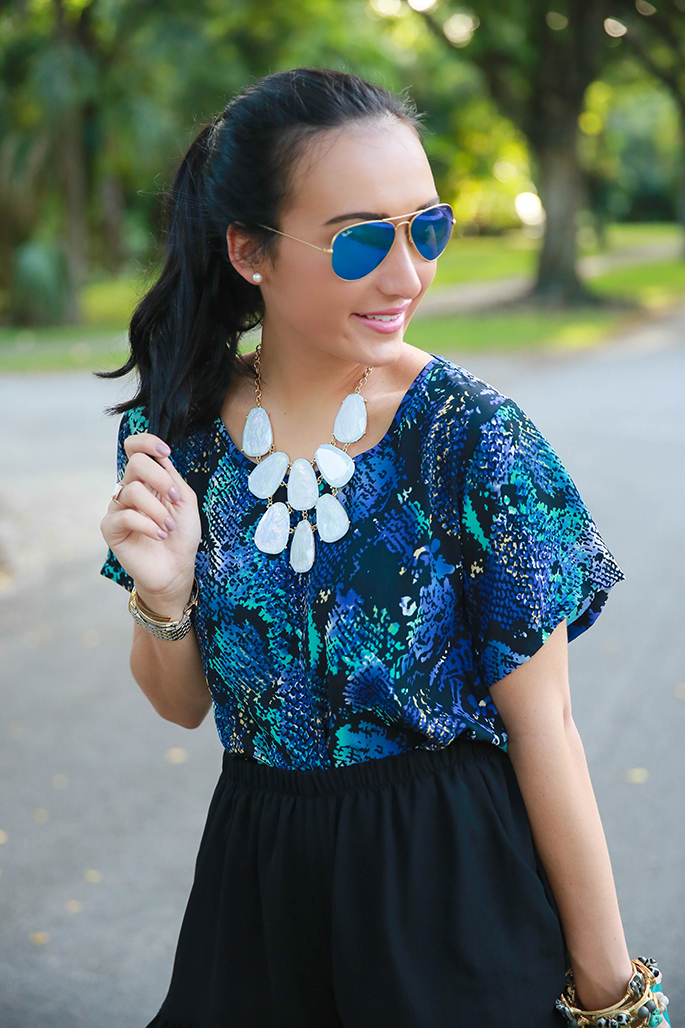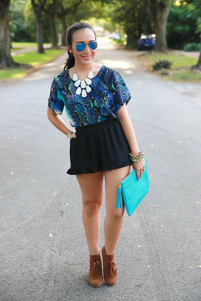 Yet another collaboration with a fabulous blogger! Sharrah, of Shar Style, and I decided to show you two different ways to play with patterns and prints. While I opted for a patterned top, Sharrah went for some trendy printed pants, which I absolutely love! I recently got these amazing booties and decided to add some spunk to my shorts by mixing them into my outfit of the day. I love blues and snake print so this was basically a match made in heaven for me! Make sure to follow Sharrah on insta to keep up with her style diaries!