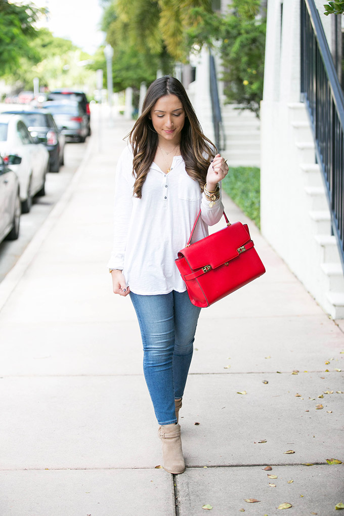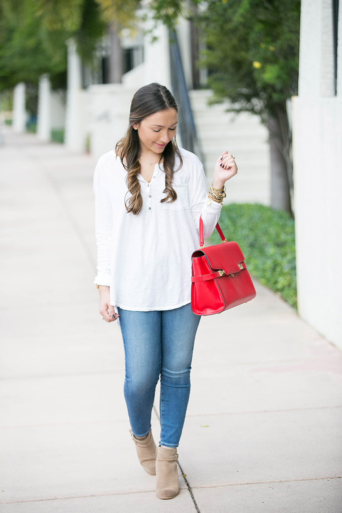 Between yesterday’s outfit and today, clearly I am into subtle pops of red lately! This henley top has been my go-to these past few days, ever since I got it. It’s so comfortable and really just does the job! I got an XS, so make sure to size down. I’ve never really found a henley top that I love but this one is great because it’s comfortable, long enough for leggings and perfect with a scarf thrown over. I might pick up the charcoal color!