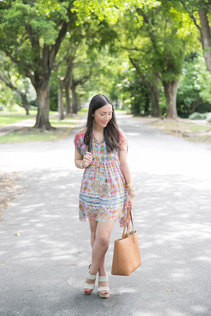Anything that is comfortable, flowy and has prints is perfection in my book, with the exception of some things, of course. This is definitely a dress that’s perfect for those breezy summer nights and hot summer days. I paired it with my new white wedges, which I also have in nude, to keep it light and to also bring out the lighter colors in the dress. I also kept the accessories at a minimum. Since this dress has so much going on, I would hate to distract from it!