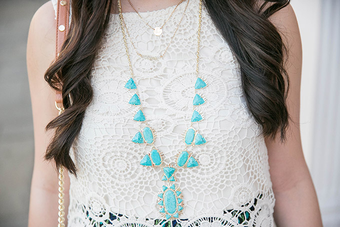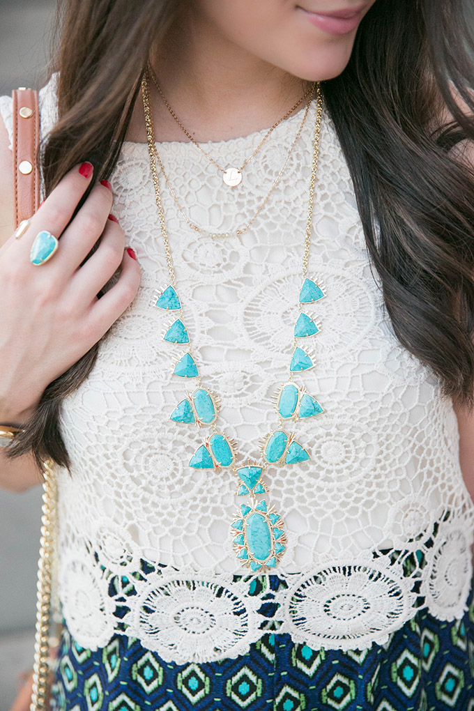 I brought out the turquoise from the bottom part of this adorable romper with my long necklace and then added in some Taudrey jewels to layer everything. I’ve been resorting to layering lately and these pieces are great for just that!