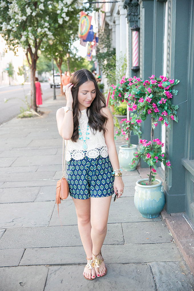 I wore this adorable romper yesterday while exploring Charleston for the first time! It’s such a beautiful city… I’m already in love. But it is pretty hot. This romper was perfect because it’s light, easy and under $50! I also love that it looks like it’s a top and shorts instead of a romper. I kept it casual with some sandals and a fringe cross body (my go-to lately). I do recommend sizing up, though. I’m wearing a size medium.